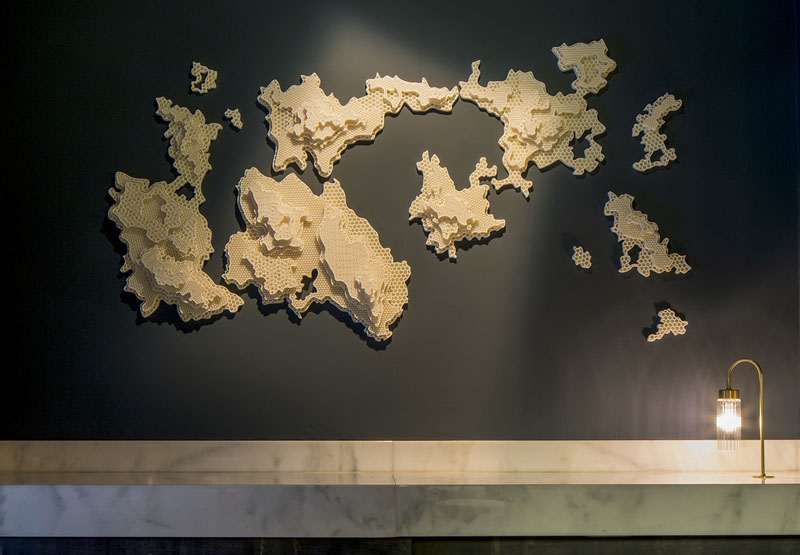 Nada más entrar en el local nos encontramos con una pieza escultórica impresa en 3D en polímero reciclado y producida por Comme des Machines. Lavela suele hacer este tipo de aproximaciones al mundo de la impresión 3D. En Lamian by Soy Kitchen, aparte de hacer el interiorismo, diseñaron unas carcasas para las cartas en 3D de lo más funcionales e interesantes, también producidas por Comme des Machines.