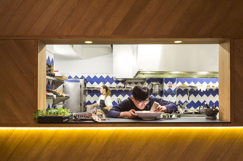 La cocina, revestida de madera de roble natural en espiga, tiene un gran espacio abierto al comedor para facilitar la conexión más entre cocinero y cliente. Esta zona está iluminada cenitalmente para resaltar su volumen.