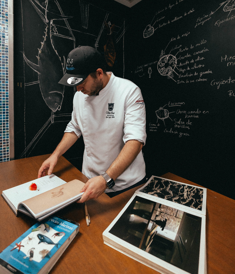 El mojo es un elemento esencial en la cocina canaria. Schattenhofer buscó reinventarlo. Para ese fin se inspiró en el “mole madre” del chef Enrique Olvera. Sobre la base de este mole creó una salsa madurada de unos 50 a 55 grados, a la que se le van añadiendo con el tiempo otros ingredientes como el plátano. La carne de cabra es otra de las especialidades de la cocina canaria. Un alimento de consumo tradicional en las islas, con un sabor contundente y adictivo. El chef ha estudiado sus razas autóctonas, sus técnicas de despiece y sus posibilidades para ofrecer la mejor carne posible. De igual forma, investiga las gallinas y gallos canarios y el modo de incluirlos en las recetas.