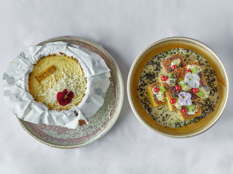 Tarta de queso fluida con parmesano rallado y bizcocho de limón y lima kefir con sopa de jengibre