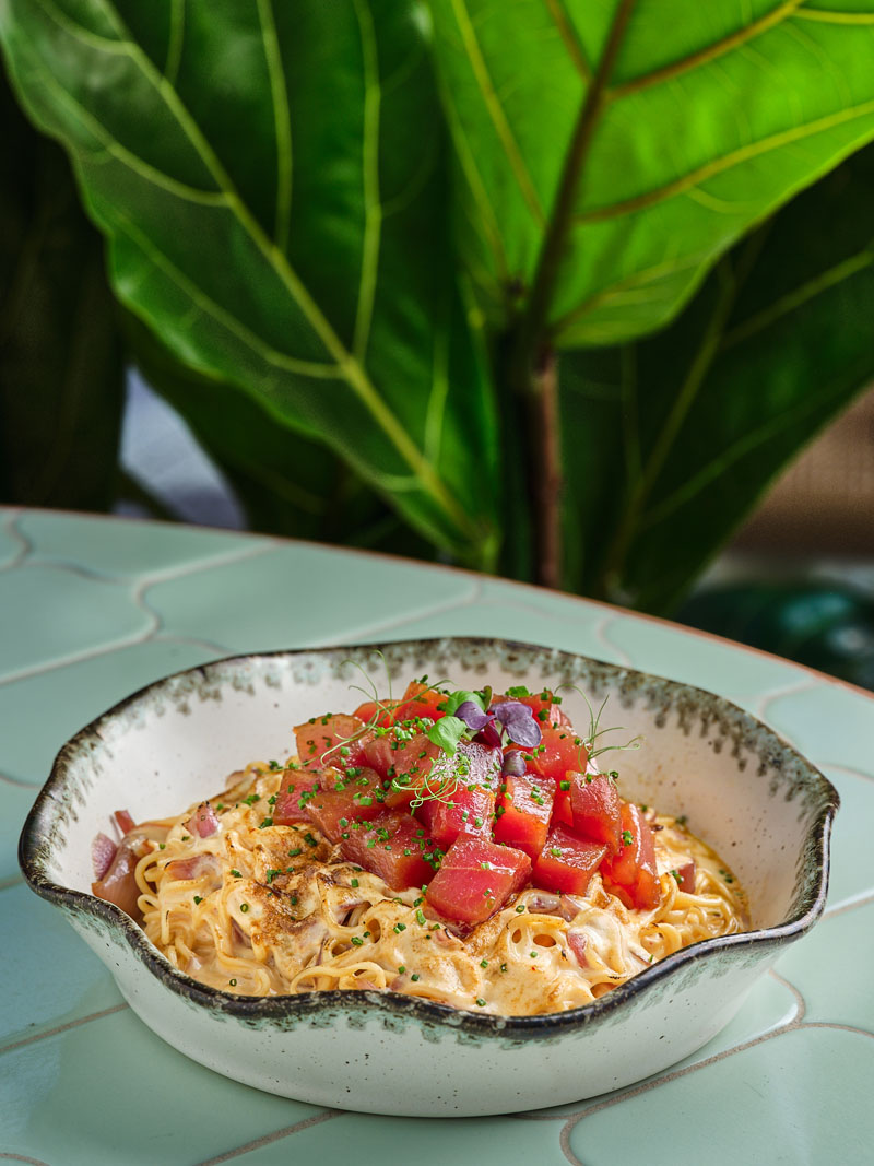 Noodles con kimchi gratinado y atún rojo.