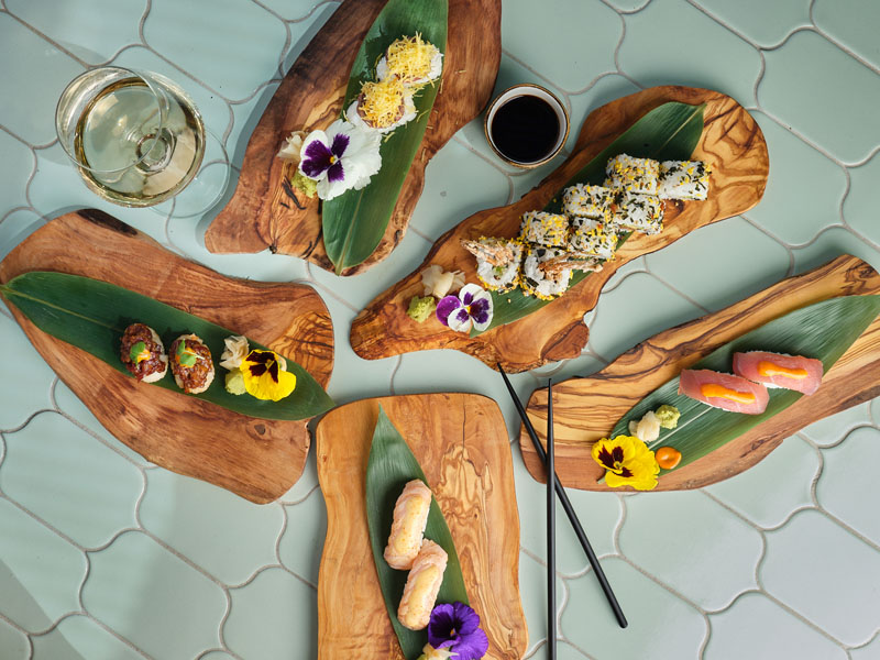 Imágenes superiores: tabla de makis y niguiris y terraza del restaurante Torcuato.