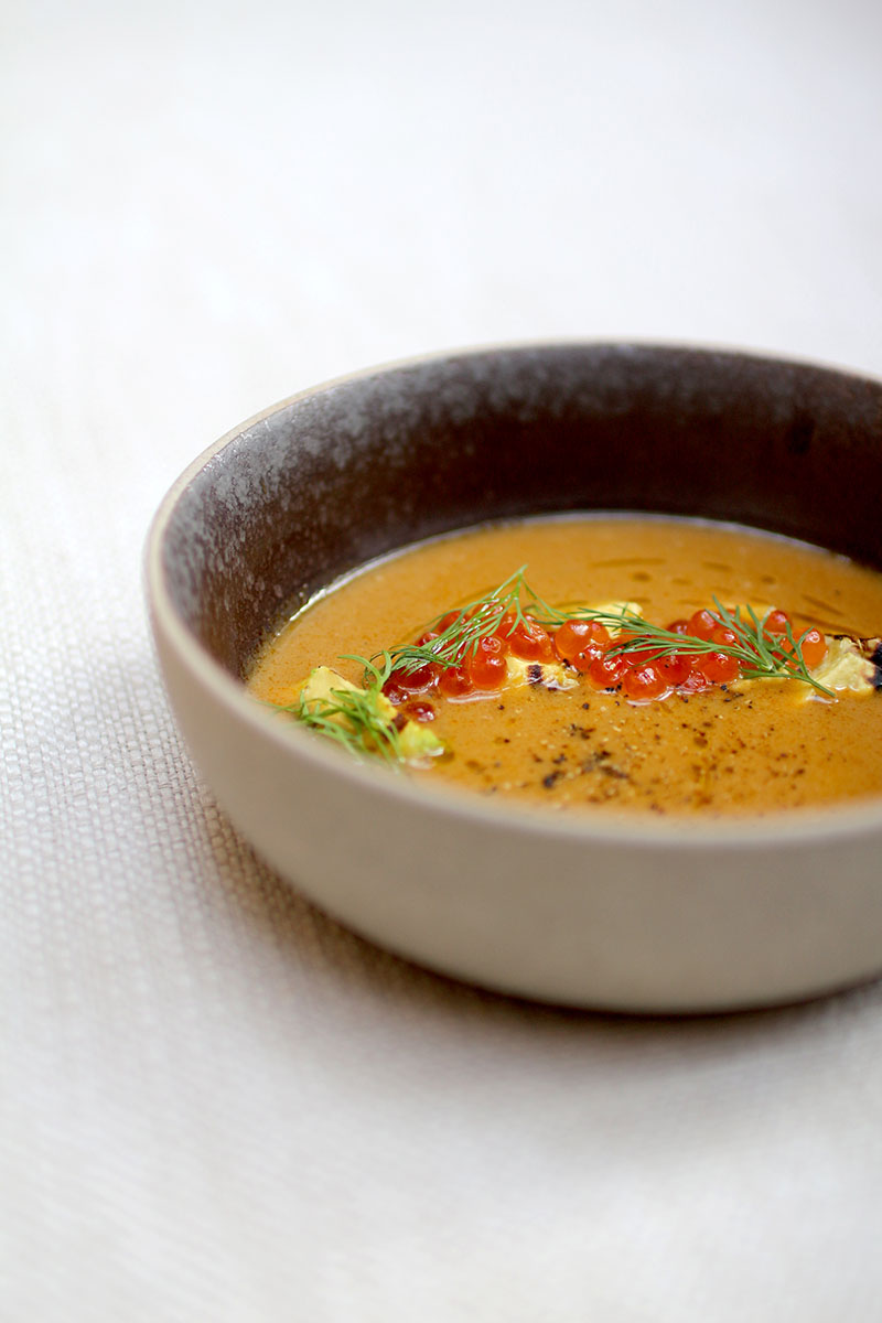 Sopa de cangrejo con aguacate y huevas de salmón