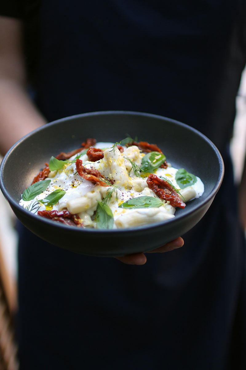 Maccheroncini con hinojo, kalamata, tomate semiseco, burrata y limón