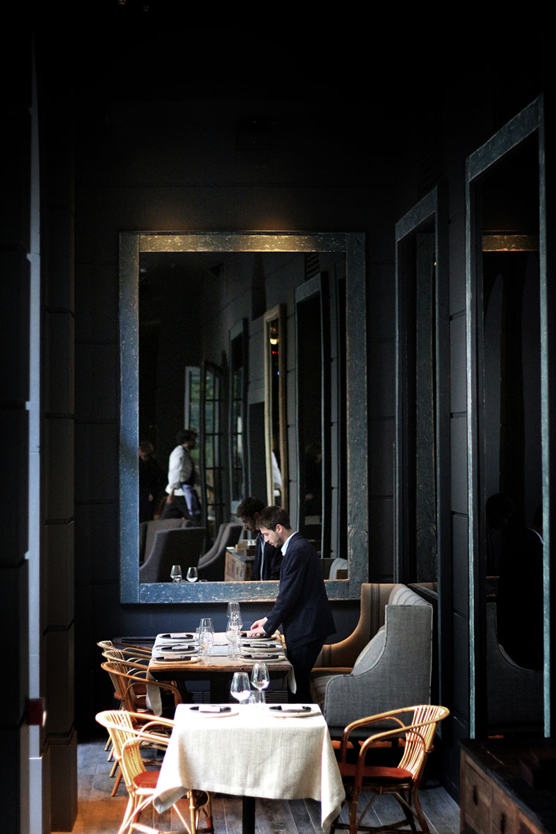 Eduardo Arruga de Estudio Lucca ha sido el encargado de trabajar el interiorismo de Tragaluz. El restaurante está situado en un enorme invernadero rodeado de jardín.