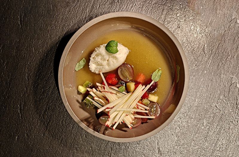 Sopa cítrica con fruta fresca y sorbete de bergamota