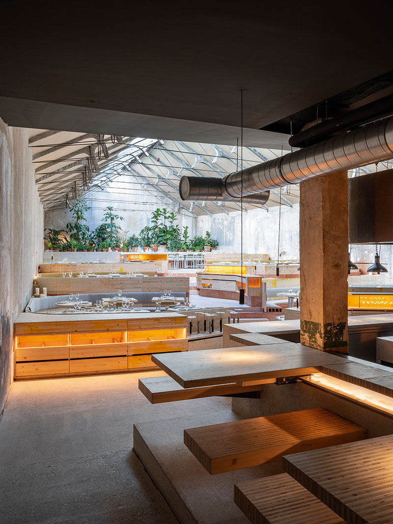 El restaurante ocupa una extensa nave industrial de estilo brutalista con una cubierta a dos aguas. Para infundir dinamismo al espacio y crear estímulos visuales, se han incorporado diferentes niveles mediante gradas que funcionan como pequeños salones abiertos. La estructura original de la cubierta es, sin duda, una de las protagonistas de este proyecto; está formada por estilizadas cerchas de hormigón y cables de acero, elementos típicos de la arquitectura de los años cincuenta, y ha sido restaurada y puesta en valor.