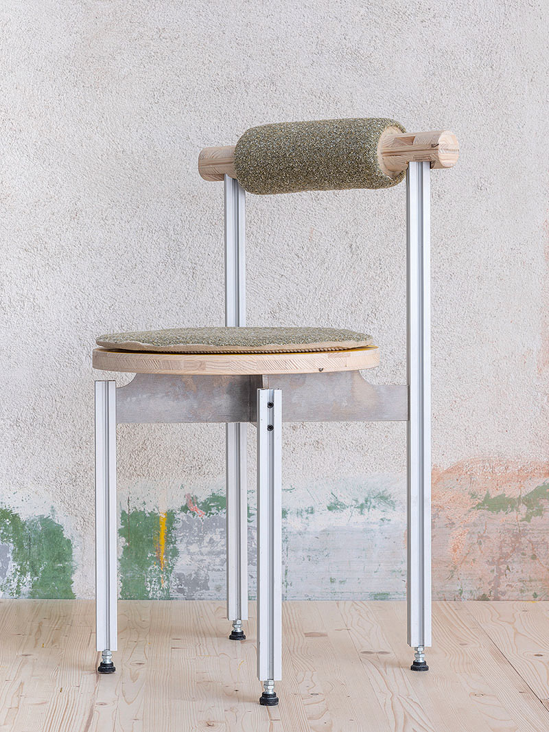 Un aspecto destacable de este proyecto es la exclusividad del mobiliario, ya que se ha diseñado específicamente para la iniciativa. Las sillas y mesas, de elegante austeridad, son creaciones de Carulla, donde los perfiles tubulares de aluminio sirven de estructuras. Además, el diseñador también ha creado unas lámparas inalámbricas que han sido fabricadas con varilla roscada rescatada de las propias obras del espacio. La varilla va unida a una batería recargable y a un reflector de pasta de algodón reciclado. Estas piezas portátiles son las que van iluminando el espacio de los salones-terraza a medida que llegan los comensales en el turno de noche.