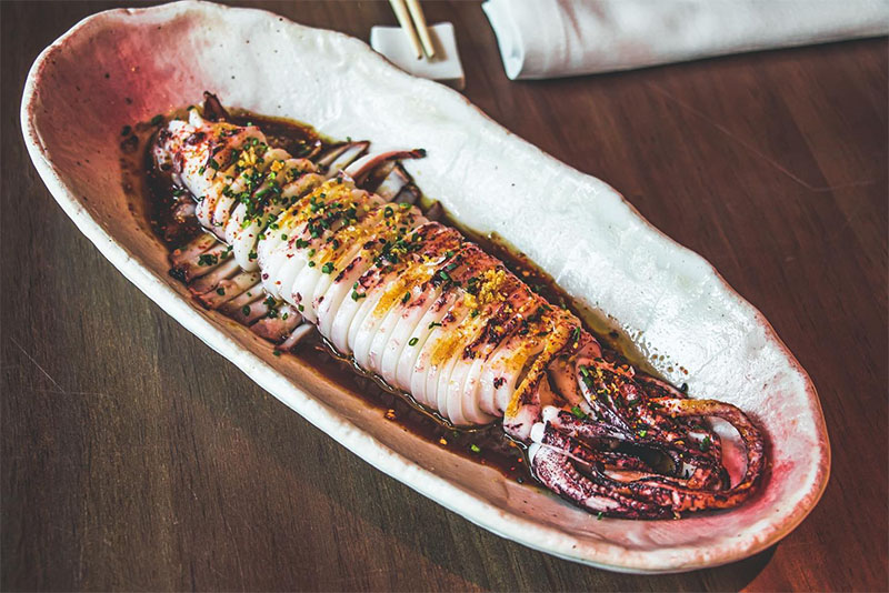 Imágenes superiores: chipirón en robata e interiorismo de Proyecto Singular para el restaurante Umo