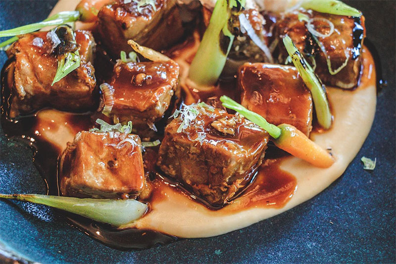 La fiesta se compone de varias fases: la primera pide unas ostras francesas con salsa ponzu, edamame picante a la parrilla, ensalada de wakame, unas gyozas de pintada de Bresse en pepitoria, o unos torreznos –sí, también aquí— con los que hay que tener cuidado porque la ración se antoja excesiva para la potencia salada que aporta. Too much.