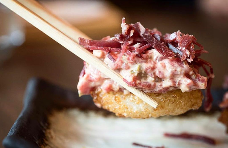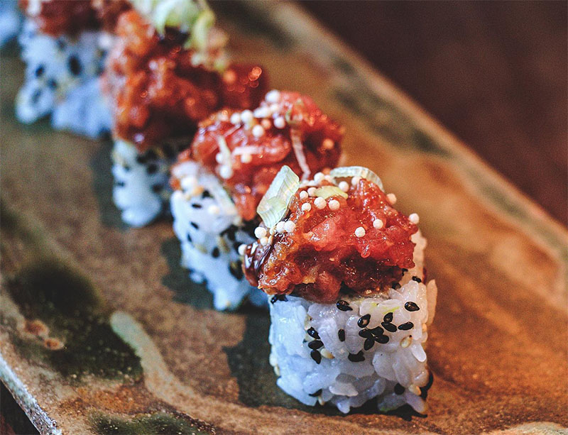 Después, resulta tentadora la versión de la tortilla vaga de Sacha, bautizada en el restaurante Umo como Tamago y que se corona con tempura de camarones. Y ya es momento de pasar a los nigiris, como el de panceta, huevo frito y migas de panko, o el frito de steak tartar y cecina de vaca, o el de toro y tomate colgar. El toro también aparece en un plato con yema de huevo o en el Hosomaki con cebolleta, mientras el Gunkan envuelve atún picante y tobikko o el Futomaki incluye cangrejo picante.