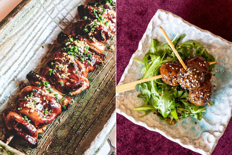 La robata da lo mejor de sí con el calamar o el chipirón de potera, el salmón o el pollo picantón de las Landas con tsubu miso, tomillo fresco y una rodaja de mazorca de maíz. El pollo de campo XXL se presenta también como yakitori con cebolla japonesa. Para los más carnívoros, la costilla de vaca, bien melosa.