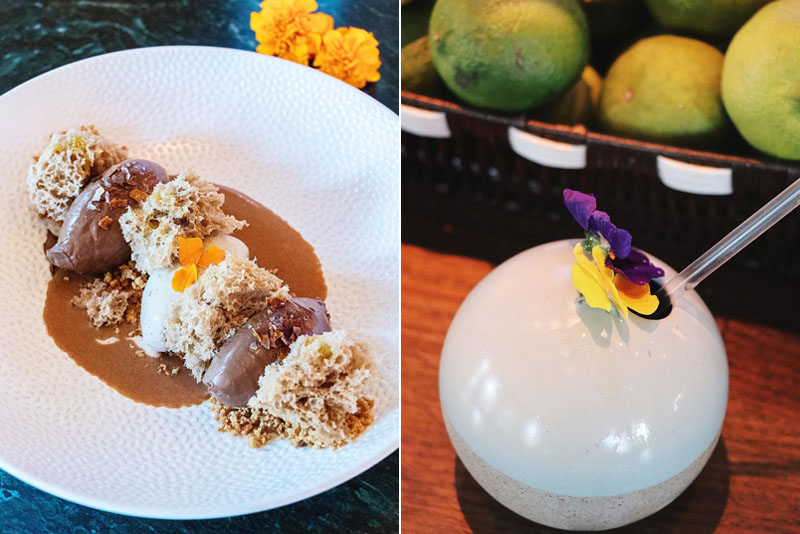 Imágenes superiores: postre de chocolate, varios cócteles y barra del restaurante Umo