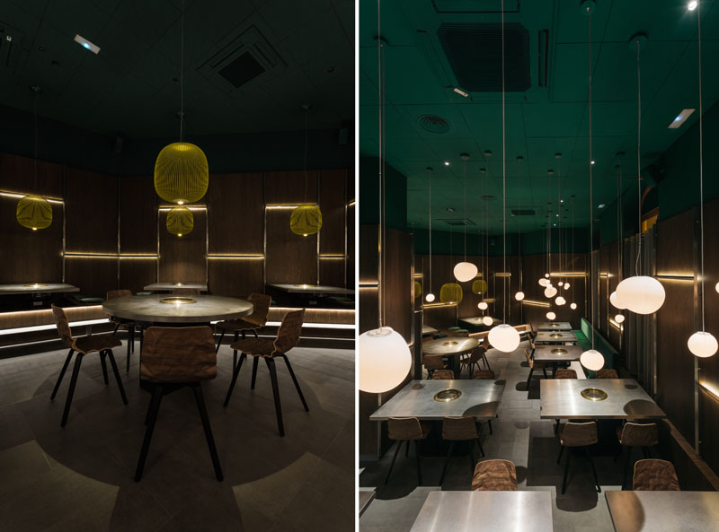 Stone Design es el estudio detrás del interiorismo de Yakiniku Rikyu. Su propuesta busca reflejar la armonía entre la innovación y el respeto por lo antiguo a través del contraste de materiales como acero inoxidable y madera de roble. Una mezcla que evoca las calles de Tokio, invocadas a través de un despiece de las paredes con bandas de acero inoxidable retro iluminado que recuerda a sus altos y emblemáticos edificios, y que en la sala principal culmina con la iluminación un chandelier flotante inspirado en un jardín zen. Cuando se avanza hacia los reservados, el acero desaparece para dejar todo el protagonismo a la madera, que se combina con diferentes tatamis, cortinas, obras de arte originales y una serie de lámparas inspiradas en las tradicionales linternas japonesas dispuestas encima de cada mesa.