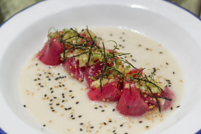 Restaurante Yakumanka: tiradito nikkei, de lomo bajo de atún, leche de tigre de ajíes encurtidos, mango verde y quinua crocante