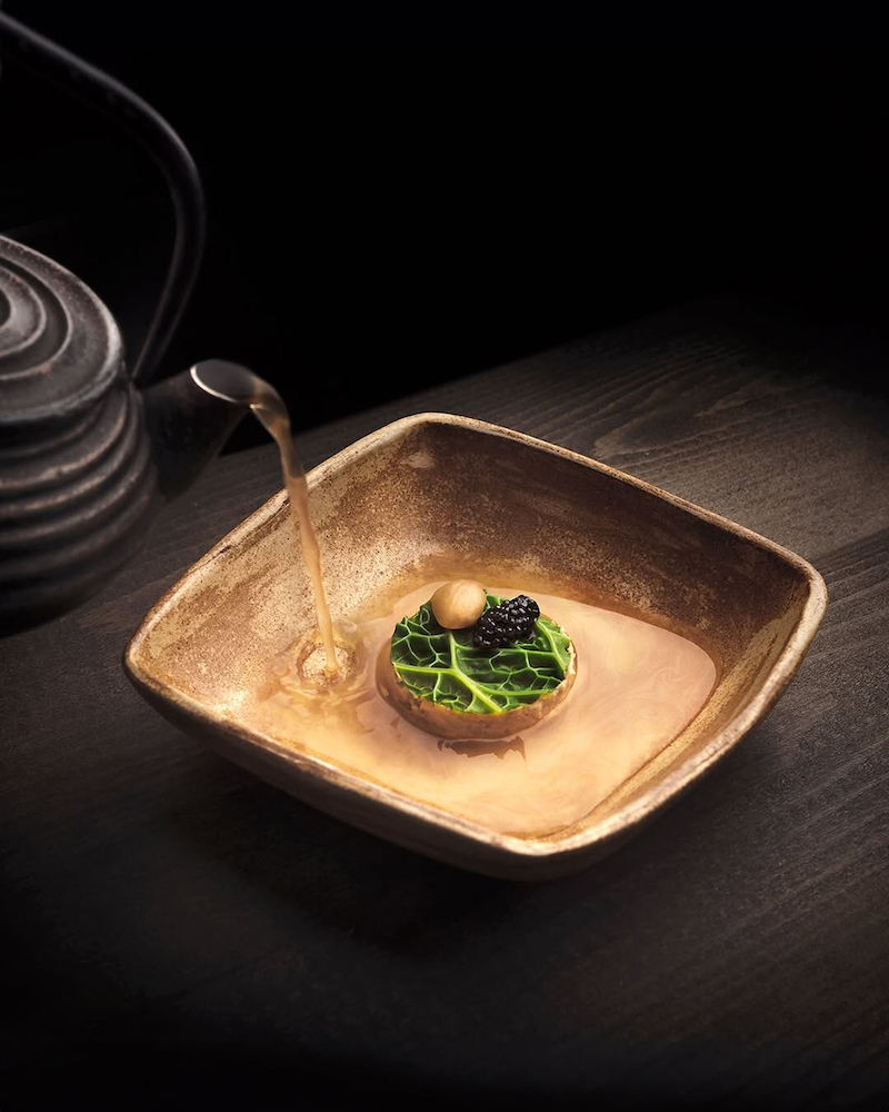 Rebozuelos, crema de tupinambo y yema de Javierre confitada
