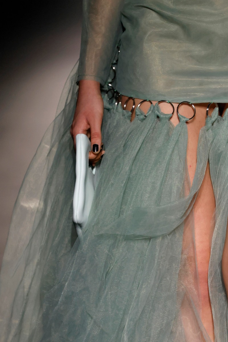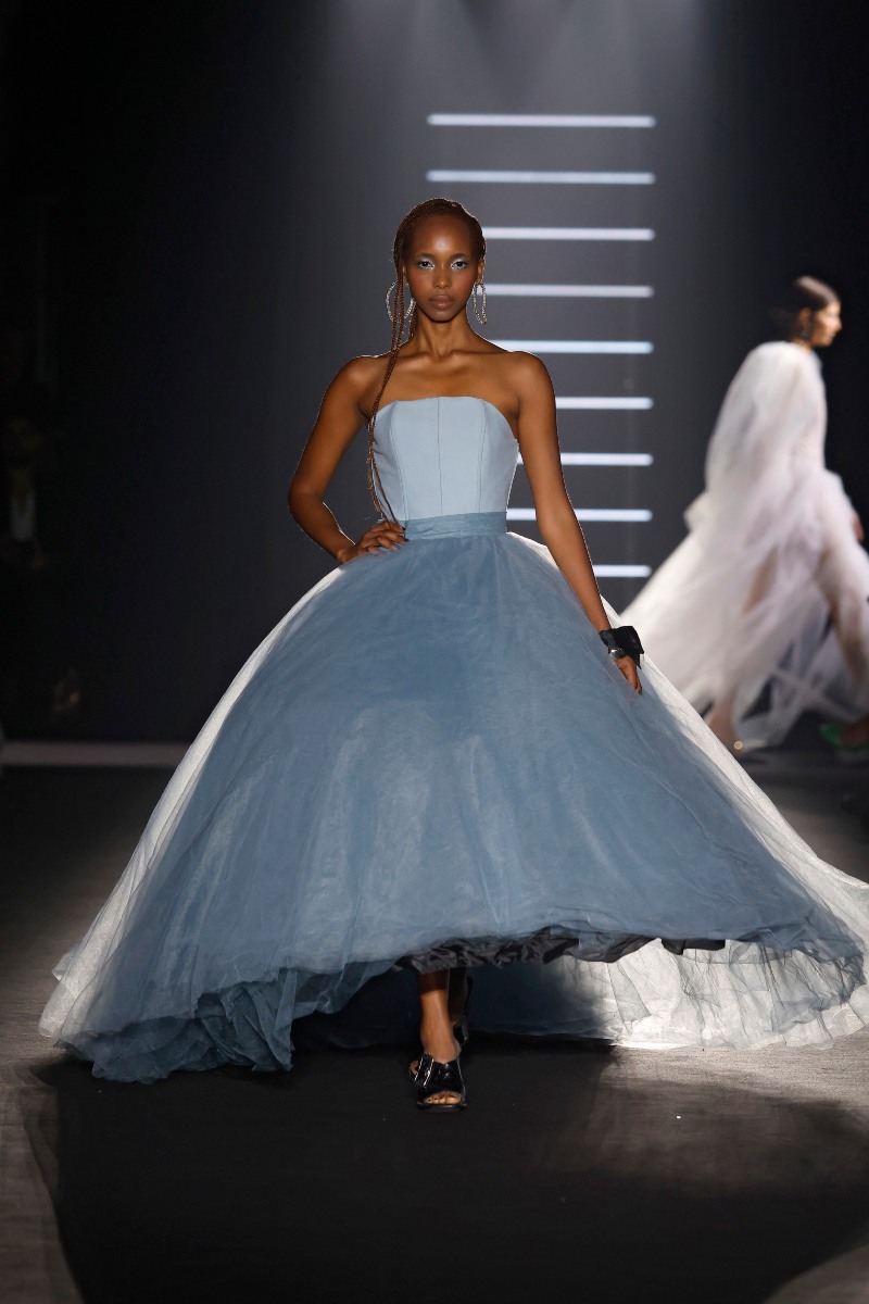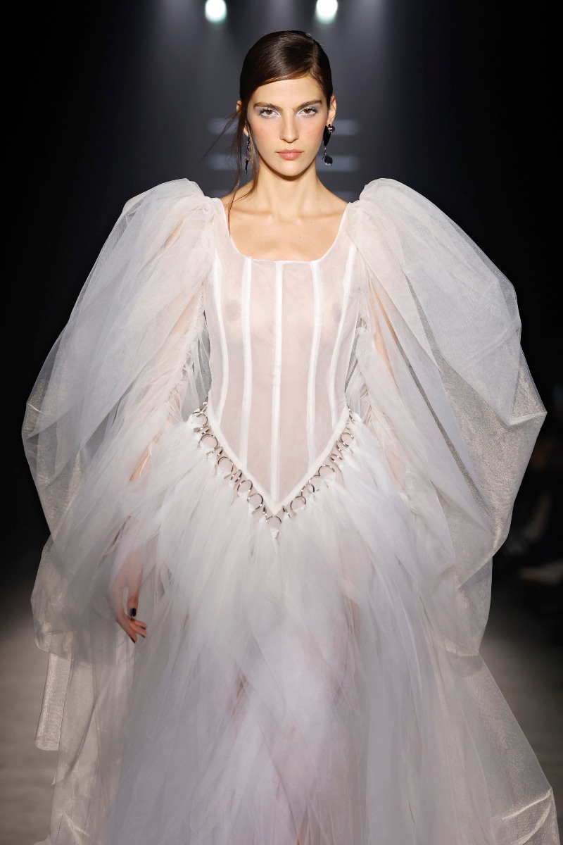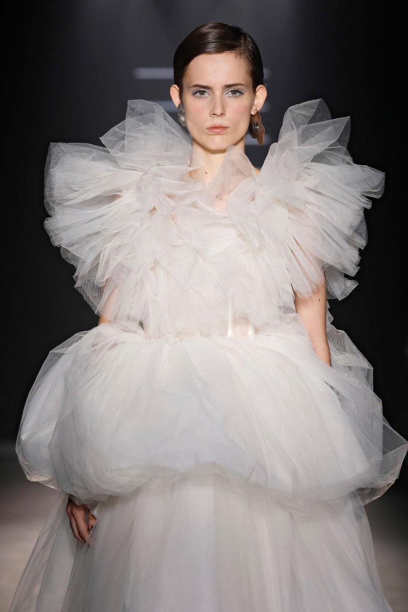(Reveligion) Hay un total de 22 diseños en tul y, como siempre, he incorporado técnicas nuevas en las que estoy trabajando, concretamente en tejidos como la organza y en tonos apagados que van desde el negro y el denim hasta el beige y el verde. En relación con la silueta típica de Reveligion, he intentado darle un giro y trabajar técnicas que no había explorado antes. Por cierto, no quiero dejar de mencionar cómo he integrado el tul. En esta ocasión, he trabajado este tejido para dar mucho volumen, utilizando la técnica del drapeado y añadiendo mucha corsetería, sin olvidar las flores. ¡Es una colección brutal!