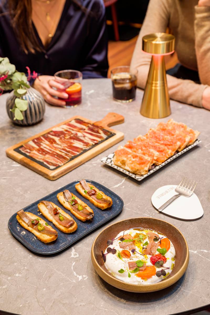 Imágenes superiores: 1) Salón de Reversible, inspirado en conceptos muy ligados a Barcelona, como los Juegos Olímpicos o Joan Miró. 2) Surtido de tapas, entre las cuales se encuentran las croquetas cremosas de jamón ibérico, rabo de ternera o gambas.