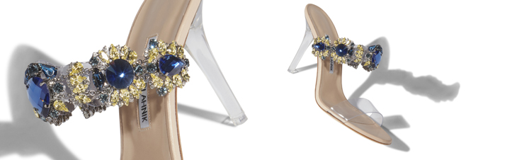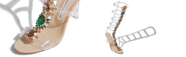 Las cuatro sandalias han sido creadas en PVC, para que la estructura pase completamente desapercibida, incluso el tacón es de plexiglás, otorgando toda la importancia a la decoración con accesorios y cristales milticolor de Swarovski. Una mule de medio tacón, una de tacón alto, una sandalia de tiras y una sandalia de gladiador hasta media pierna son los formatos de estos diseños para Cenicientas del s.XXI, eso sí, ¡ni se te ocurra perder uno de esos zapatos joya!