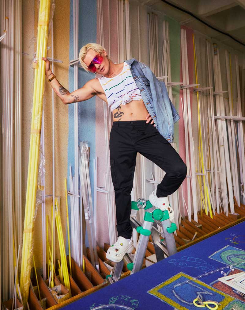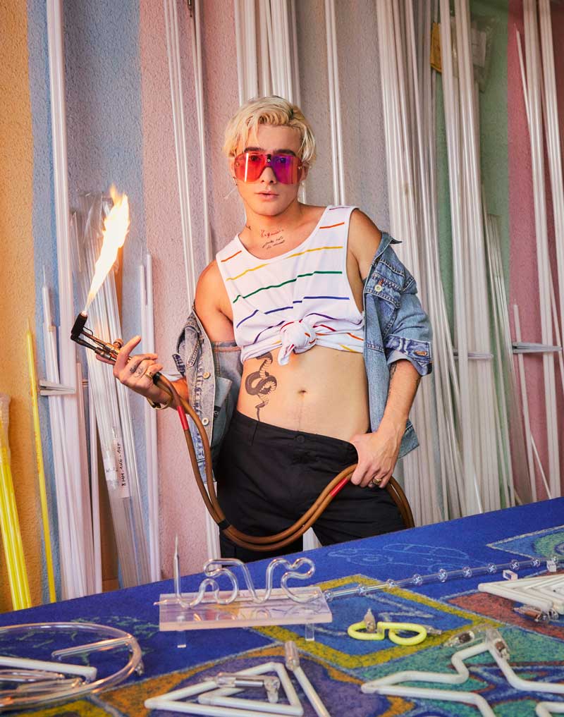 El artista y cantante Roi Porto en su taller de neones con look completo de Dockers, gafas de Carrera y zuecos de Crocs. La camiseta forma parte de la colección unisex United by Love con la que Dockers apoya a la comunidad LGTBQ+ a través de la fundación Stonewall Community