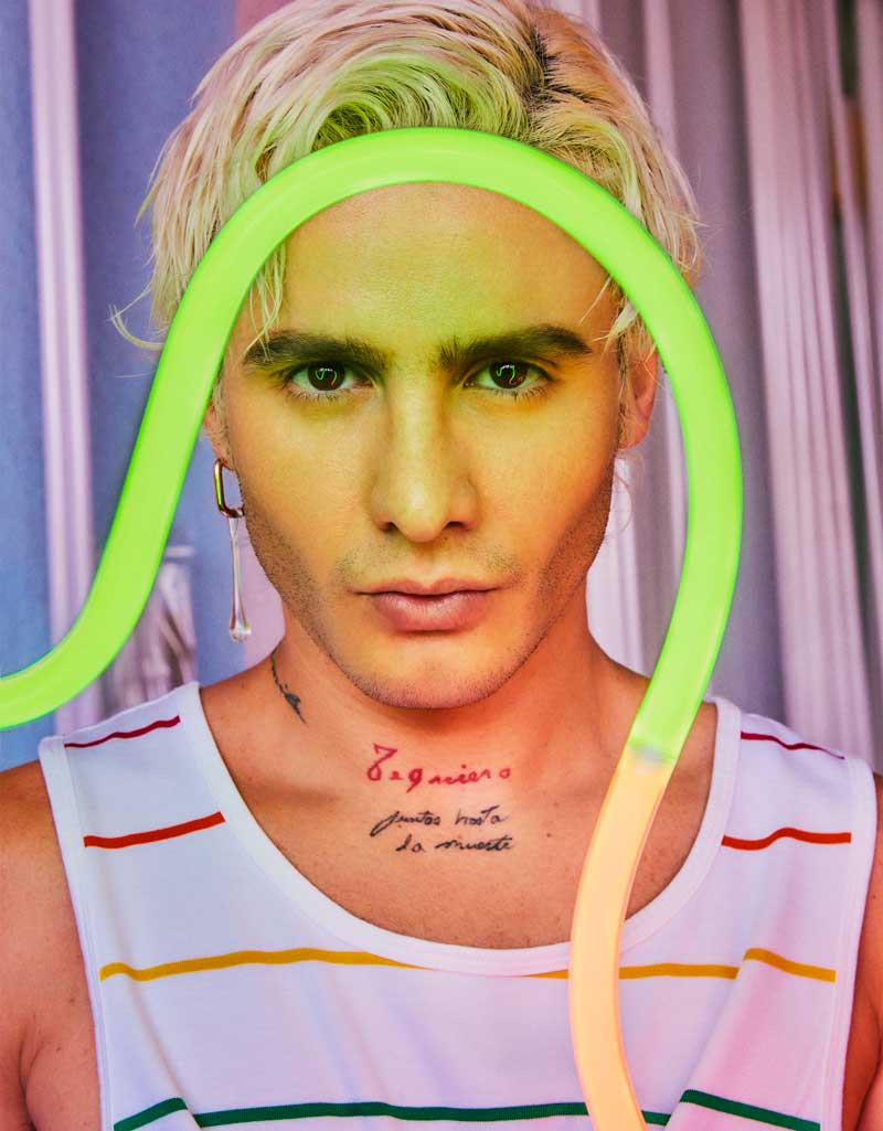 Arriba, fotografíamos al artista multidisciplinar en su taller de neones en Madrid con un look de Dockers estilizado a lo Roi Porto, con camiseta de la colección especial United by Love de Dockers que celebra el Orgullo a través de su colaboración, por cuarto año consecutivo, con la fundación Stonewall Community. Gafas de sol Carrera.