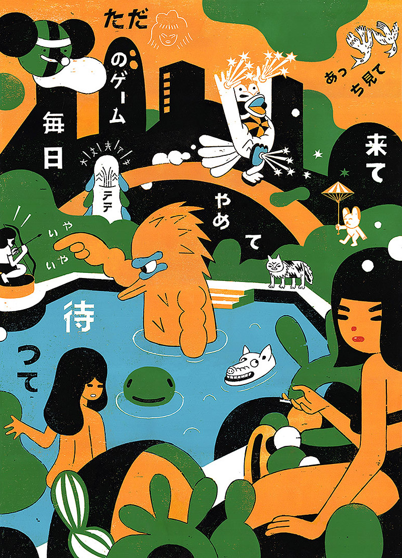 “Me interesa tratar con lo extraño en sí mismo”, dice Klonek, cuyos personajes peculiares a menudo se sitúan en entornos incómodos o inesperados. Las palabras y frases en escritura cirílica o kanji son una característica habitual, mientras que formas claras y bloques fuertes de color añaden dinamismo.