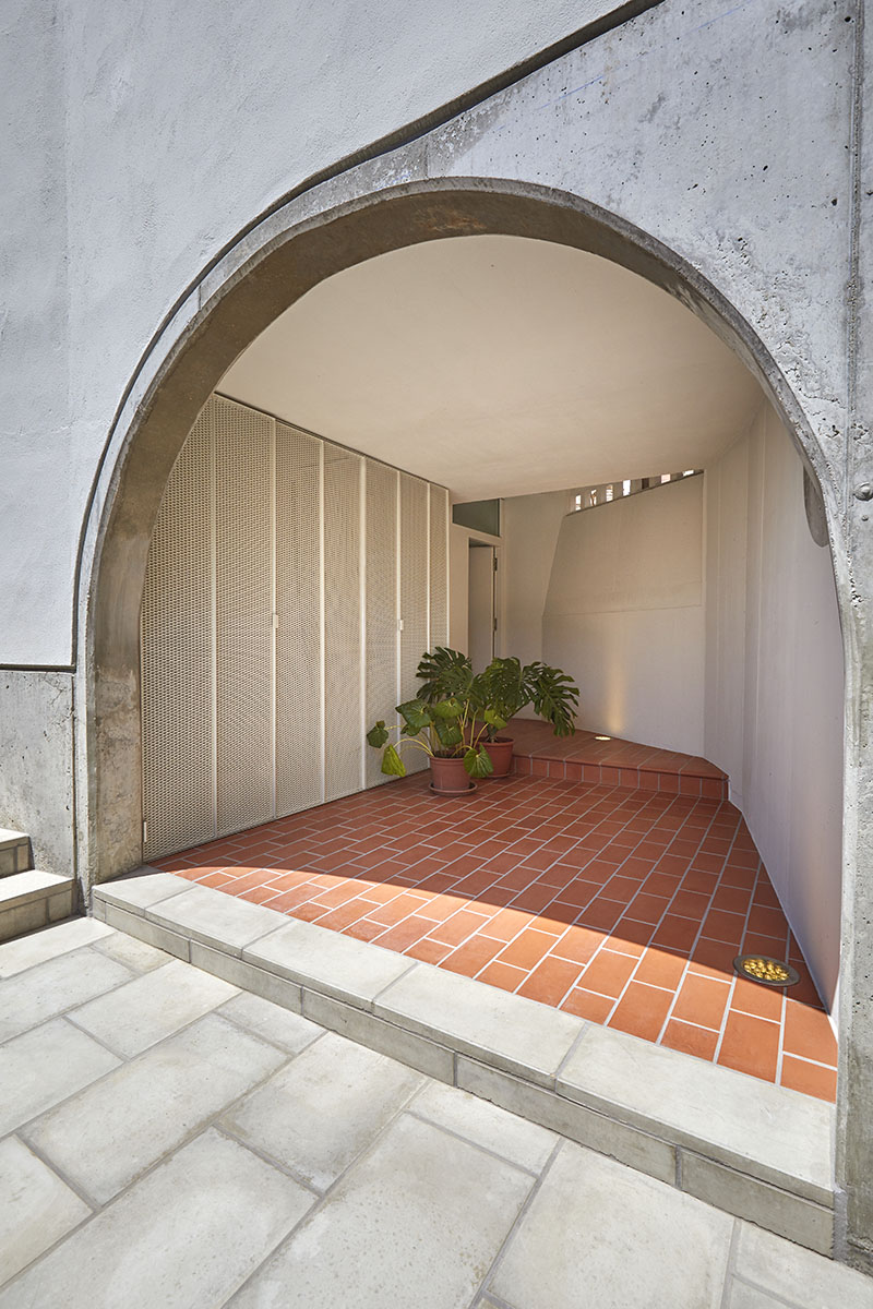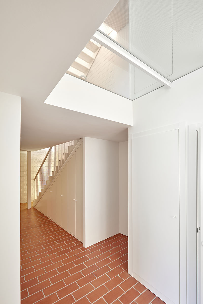 La distribución de la vivienda se resuelve en un total de tres niveles. De esta forma, la planta baja tiene la posibilidad de funcionar como un apartamento para invitados, mientras que la planta primera y segunda conforman lo que sería el domicilio privado de la familia. Aprovechan el desnivel con dos accesos independientes que se conectan únicamente de forma visual. Se lidia así, con las reducidas dimensiones del espacio de entrada, además de permitir el paso de la luz solar.