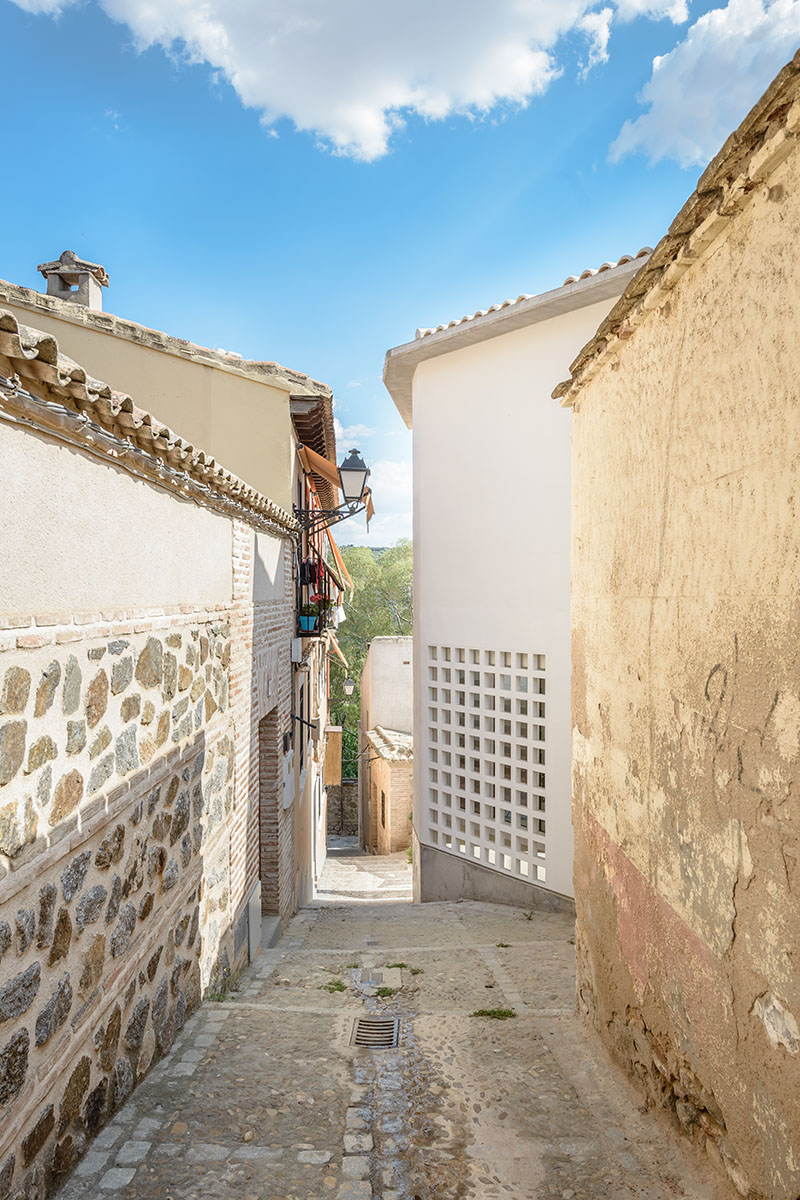 Romero & Vallejo materializa el proyecto en una parcela con un fuerte desnivel y con unas dimensiones de 8 metros de fachada y 13 metros de fondo. La característica principal de la Casa Mirador del Valle es la manera en la que el edificio se relaciona con la calle. Mientras que el cerramiento del solar es limítrofe con la estrecha vía, la fachada retrocede algunos metros para permitir la creación de un patio a través del eje longitudinal de la vivienda. Este gesto consigue que la casa logre, además de unas vistas espectaculares al Río Tajo, unas condiciones de ventilación e iluminación adecuadas.