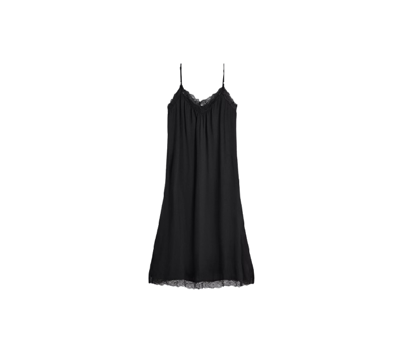 Para iniciarte en la tendencia del encaje, nada mejor que este vestido negro, elegante y versátil que combina con todo. De diseño sencillo, cuenta con aberturas laterales en el bajo y un delicado detalle de encaje en la zona del escote en pico. Además, su tejido ligero lo convierte en la opción perfecta para no pasar calor este verano.