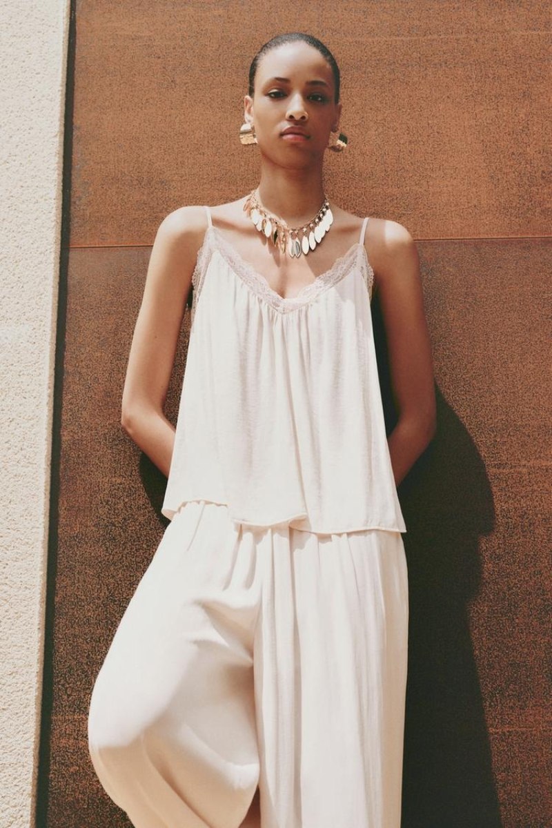 Terminamos con otra de nuestras opciones favoritas con encaje de Lefties: este top. Es sencillo, natural, y ya lo combinamos con otra tendencia estrella de este verano. Por supuesto, nos referimos a los pantalones de rayas, muy al estilo de las portuguesas.