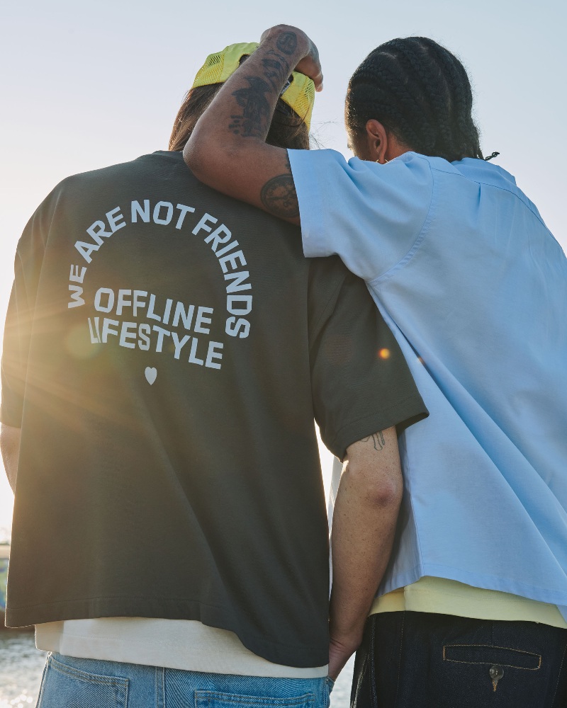 La ropa urbana veraniega de We Are Not Friends, perfecta tanto para ir de festival como para estar en modo avión con mucho estilo, incluye prendas que no pasan desapercibidas. Un ejemplo claro: sus icónicas camisetas de manga corta con mensajes directos. Todas tienen corte oversize y simbolizan ese espíritu de fin de semana que, en verano, se vive todos los días. A estas camisetas —que cualquiera reconoce por la calle— se suman los pantalones que serán tus mejores aliados para una escapada improvisada. Porque sí: la vas a hacer. Y porque al día siguiente, no sonará ninguna alarma.