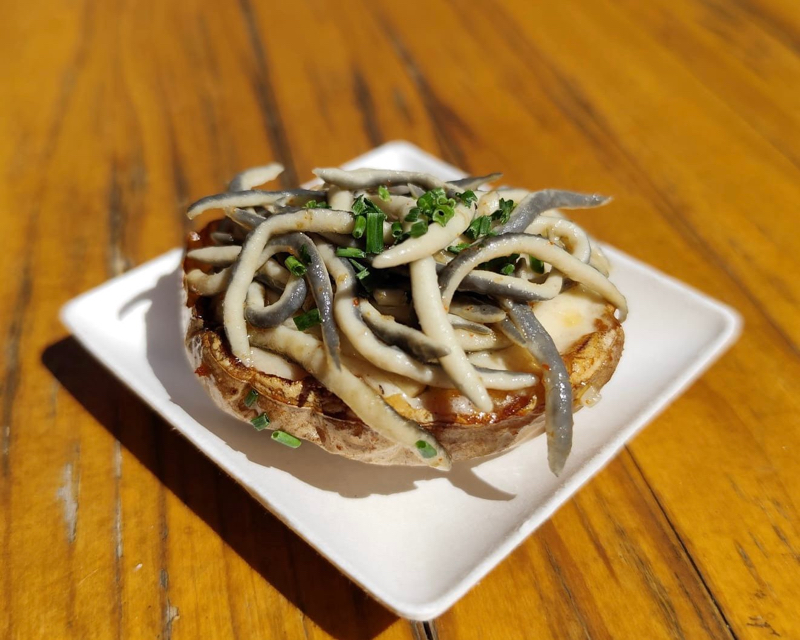Por otro lado, Shlen nos seduce con unos buñuelos de maíz y “queso” con mojo verde Canario, mientras que TropiCool ofrece un aligot con “gulas” veganas que se sirve en una cáscara de patata con “queso” crema. Y si aún tienes espacio para seguir probando propuestas culinarias, Vega Luna tiene una focaccia al romero rellena de berenjenas y “mozzarella” con una passata de tomates asados.