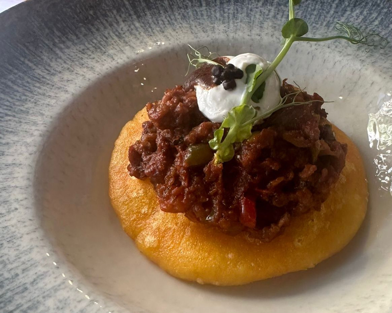 El viaje palatal comienza con un plato que nos transporta a Sicilia, cortesía de Choose Restaurante: crujientes spaghetti de cannolo con caponata, pesto y perlas de aceite de albahaca. A continuación, nos encontramos con la propuesta de Cookaluzka: unos Tortos con picadillo a la sidra.