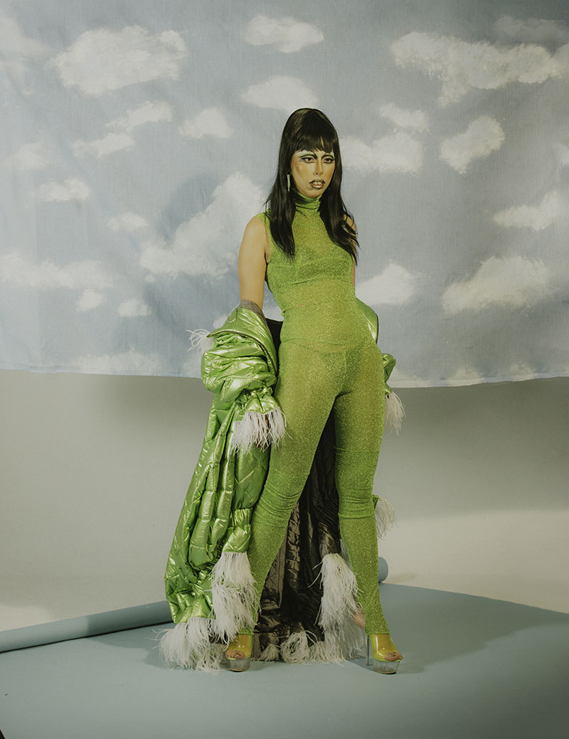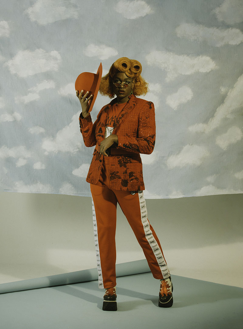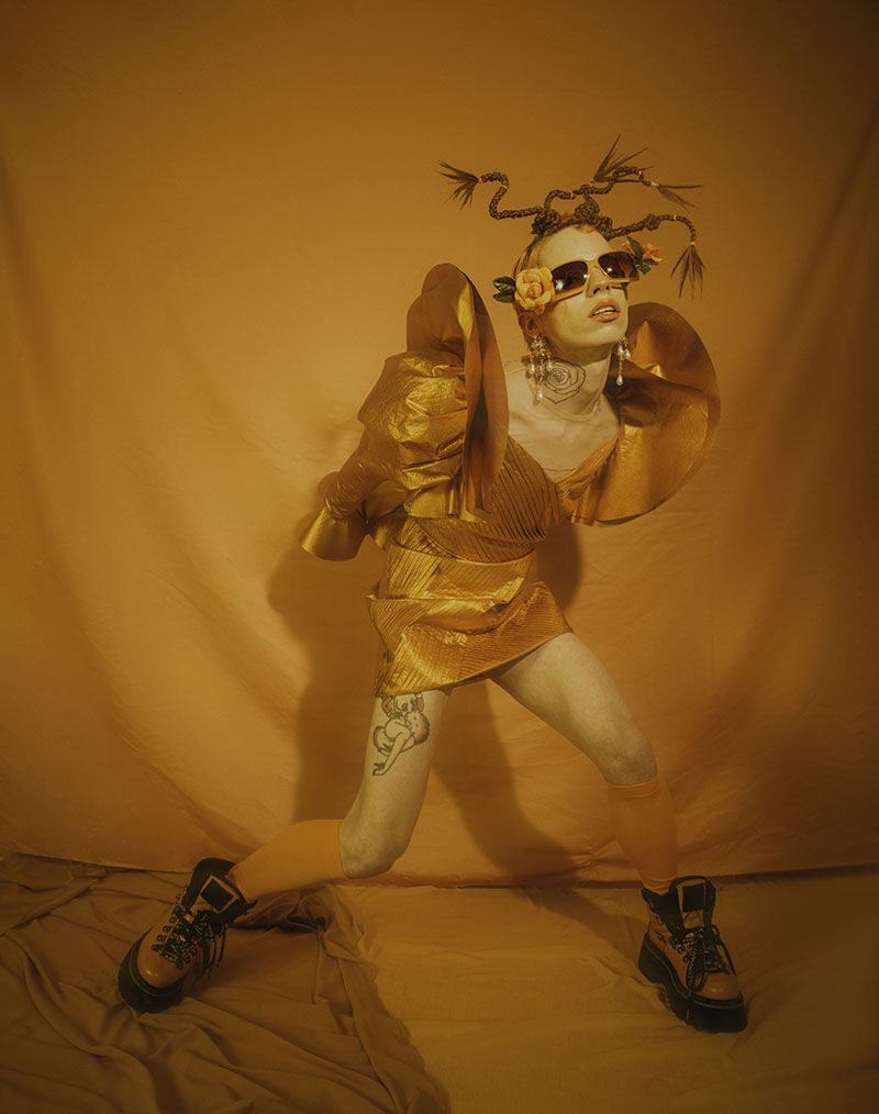 Foto Arriba: Megane Mercury lleva chaqueta de Ana Loking + Pantalón y camiseta Volchok Clothing + Gafas The 2nd Skin Co + Botas Aftr Barcelona + Sombrero Judit Matas Font.
