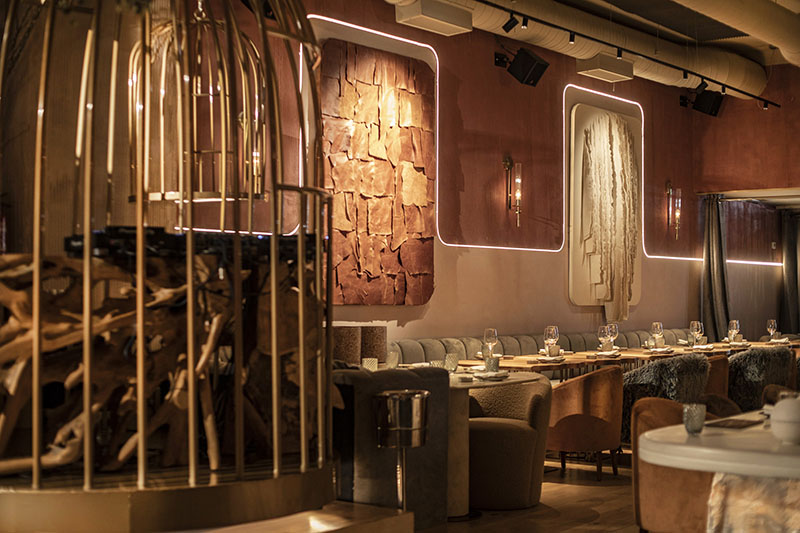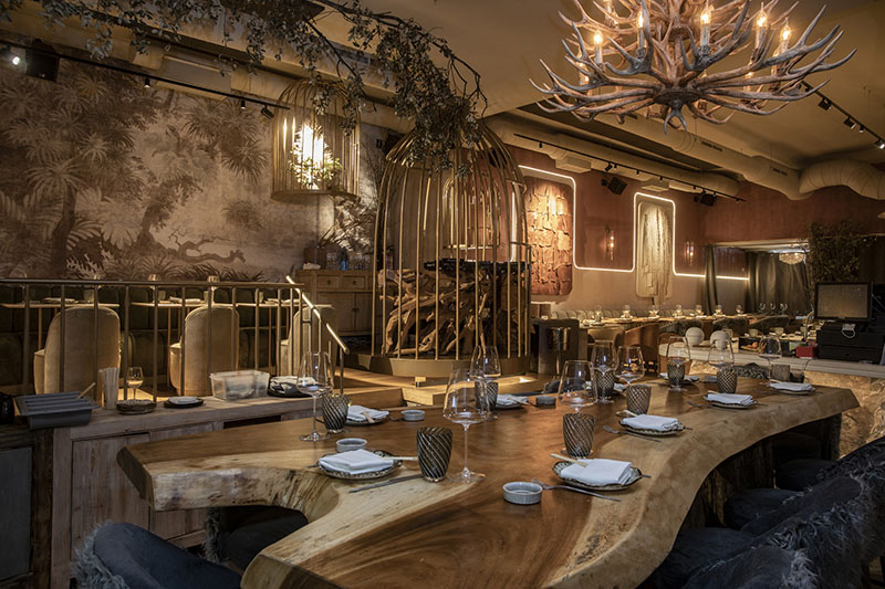 Imagen superior: vista general del restaurante Salvaje, con una jaula en primer plano