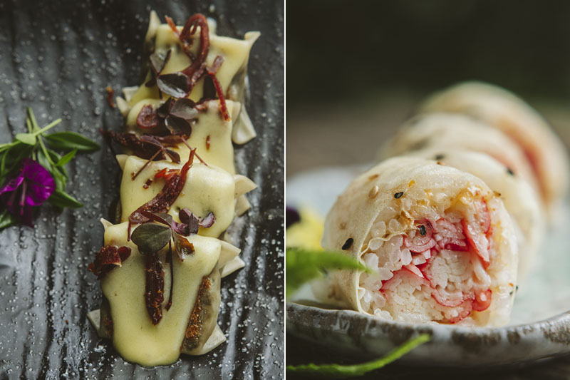 Imagen superior: dumplings de seta trufada y roll Dinamita