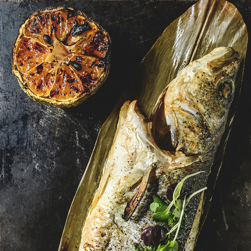 Imagen superior: lubina y robata en la mesa del restaurante Salvaje