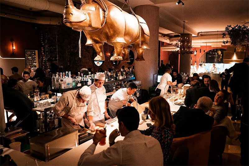 Imagen superior: mesas altas y cocina vista en el restaurante Salvaje