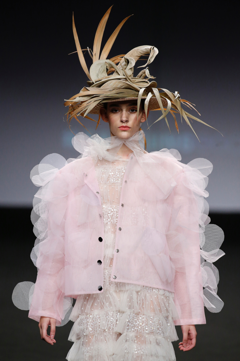 El blanco, rosa palo y azul claro han sido los tonos usados por la diseñadora. Todos los tonos han teñido los vestidos, los volúmenes y las hombreras. Hay que resaltar las pamelas o sombreros que se han utilizado con adornos basados en la naturaleza. Es un conjunto estético de ensueño para crear imaginación y un nuevo prototipo de mujer.