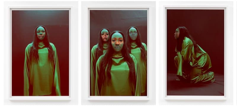 Sandra Mujinga: Para estas piezas empecé mirando los retratos de Malik Sidibe y pensando en los retratos en el contexto de la posindependencia de Malí en los años sesenta. También me fijé en retratos familiares personales y pensé en cómo habían desaparecido los rituales en torno a la reunión y la realización de retratos familiares. En la serie se puede ver el mismo cuerpo multiplicado pero con rasgos faciales diferentes. Los rasgos faciales son compartidos, de modo que nunca reconoceremos realmente un rostro concreto.
