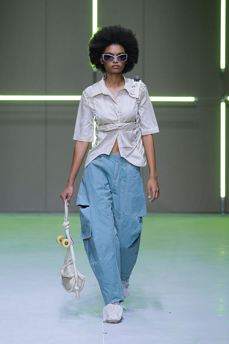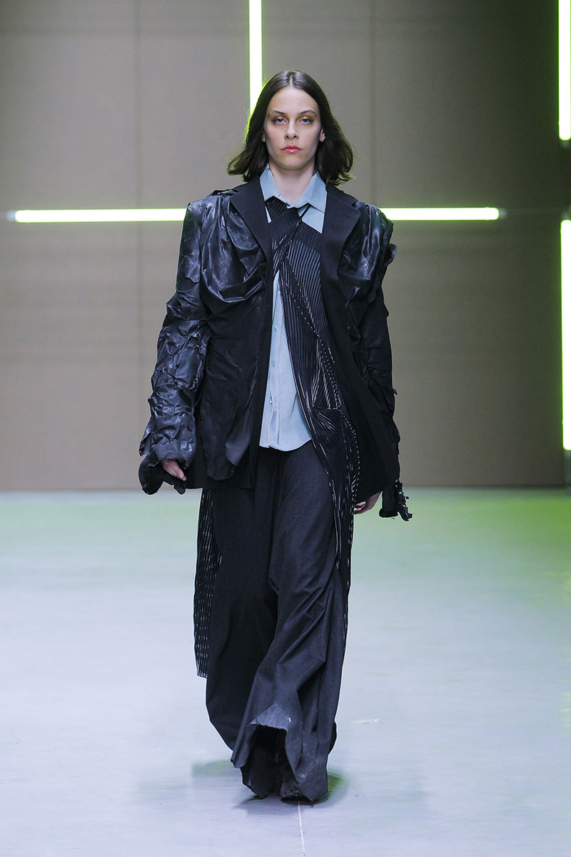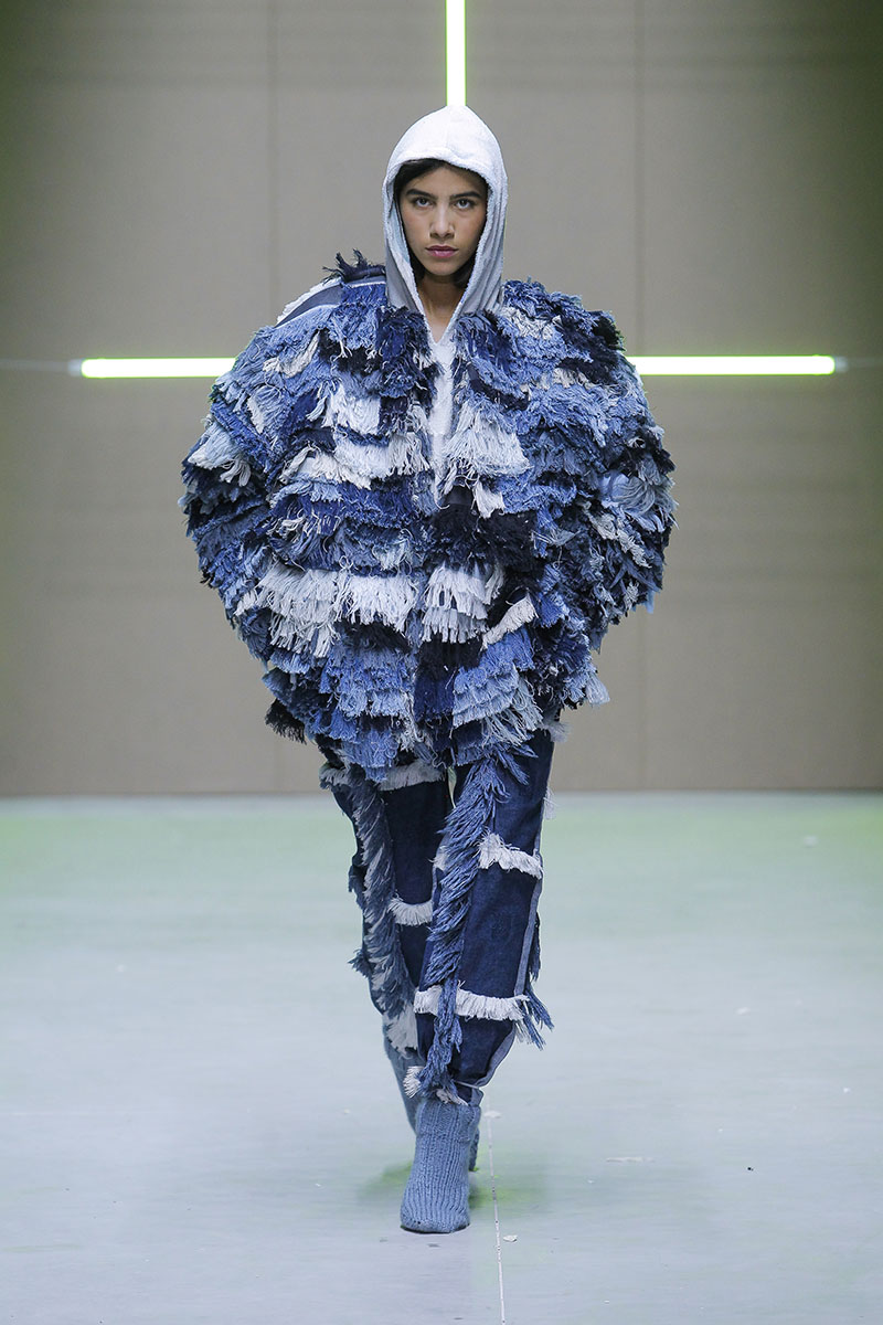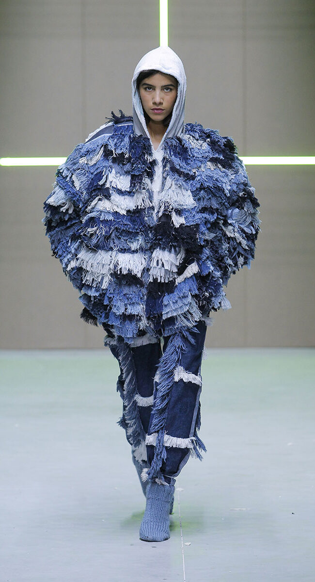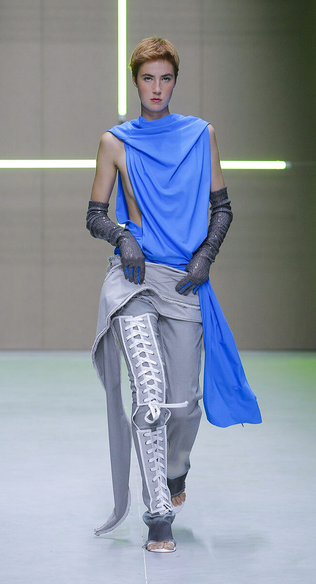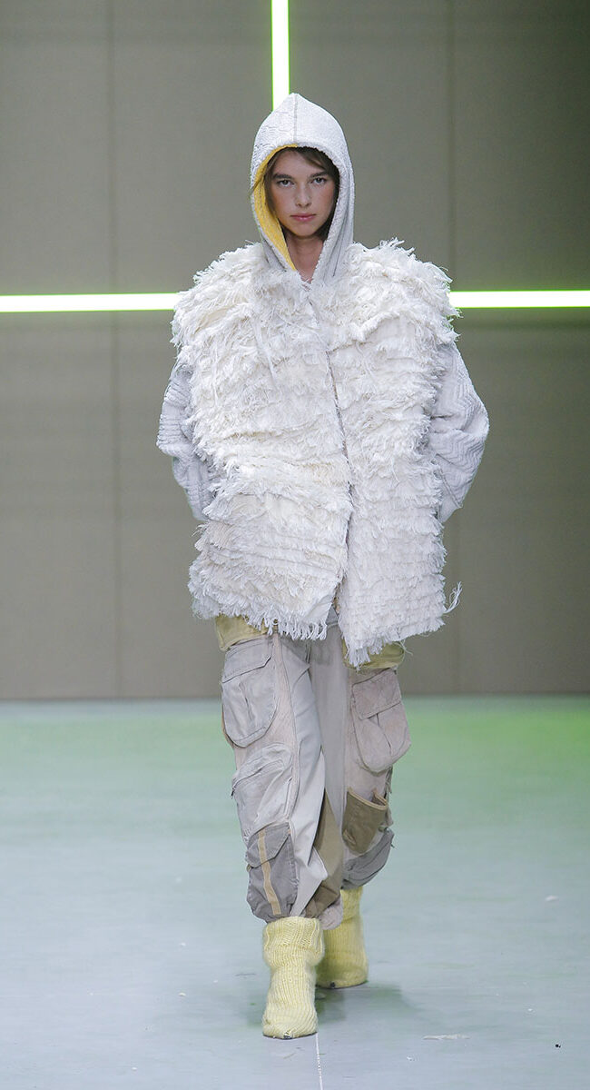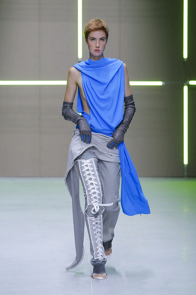 A través de sus diseños muestra cómo serían los uniformes de un “nuevo mundo” sin civilización, con calles llenas de ruinas y basura. Darya visualiza cómo la ropa vuelve a su función original de proteger y calentar. Las voluminosas y complejas piezas que presenta una de las cinco finalistas de Sangue Novo ModaLisboa SS23 se construyen a través de retales rescatados, mantas, cortinas y toallas. Es hora de abrazar el nuevo mundo.
