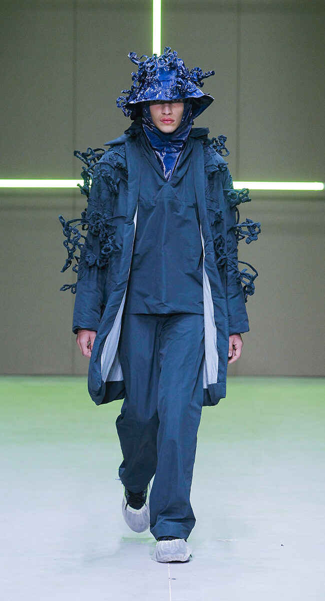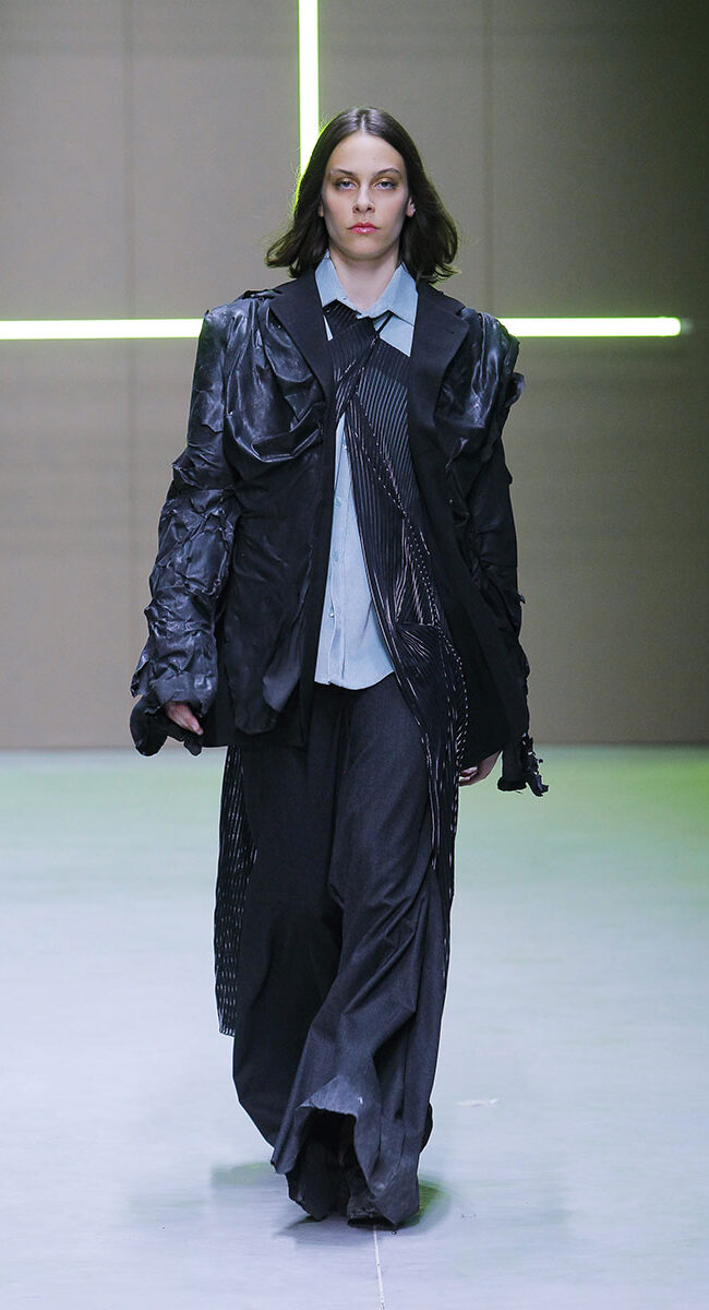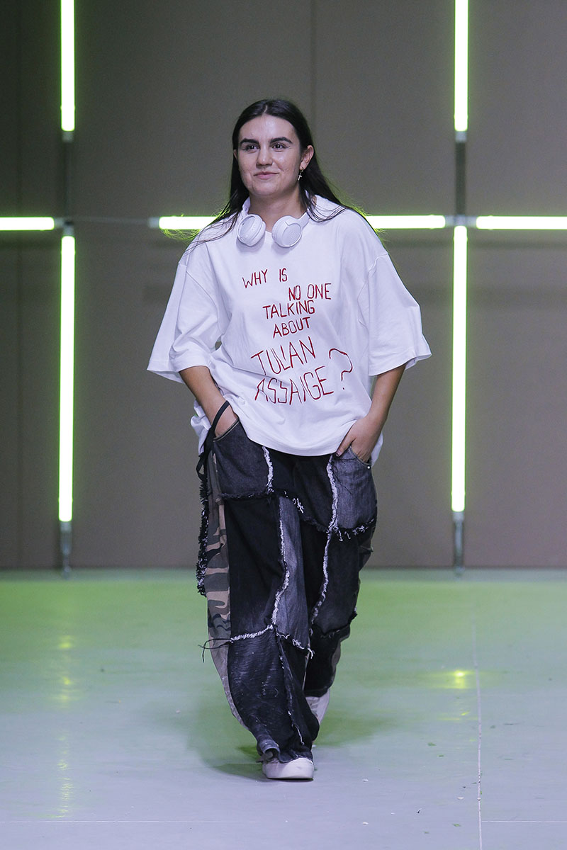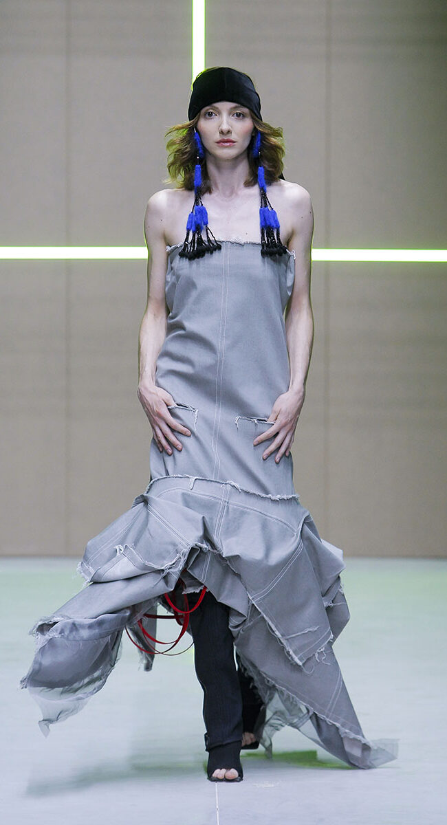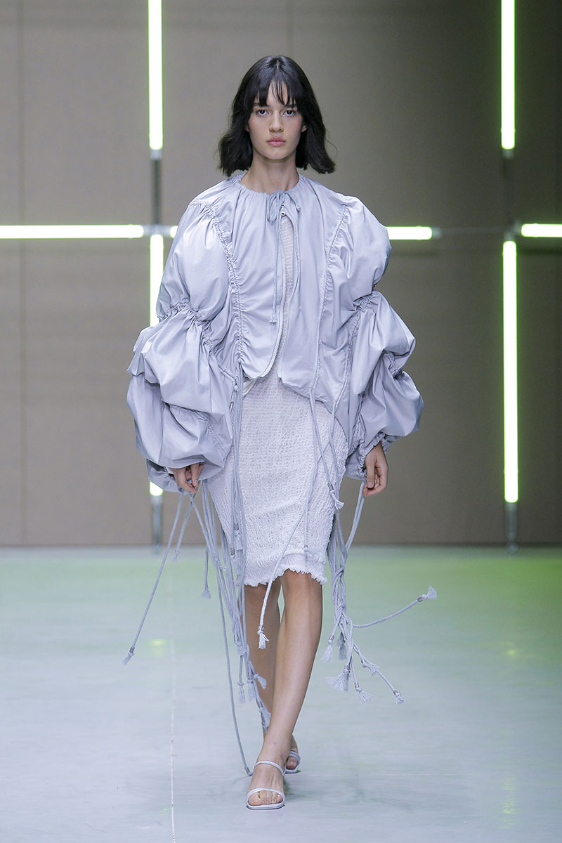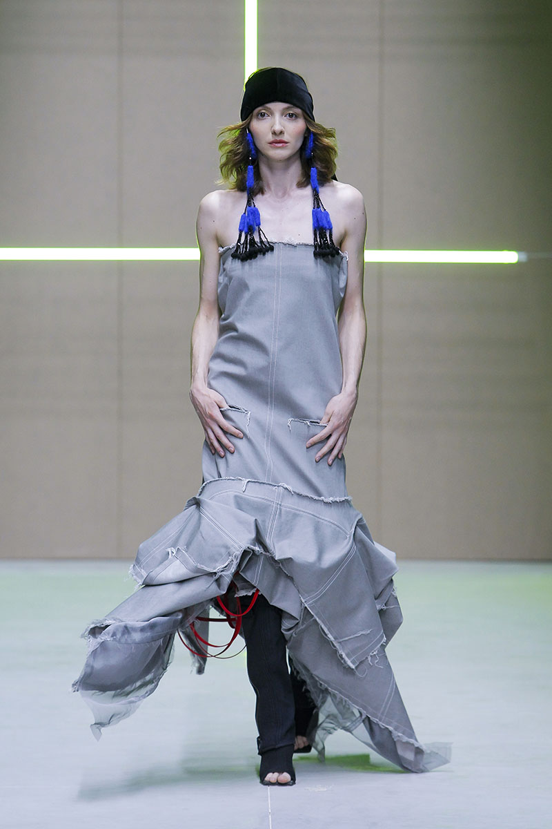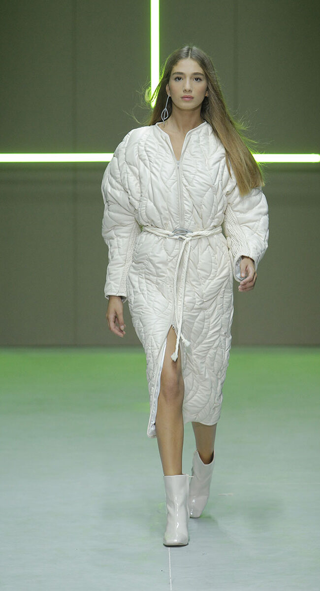 A través de sus diseños muestra cómo serían los uniformes de un “nuevo mundo” sin civilización, con calles llenas de ruinas y basura. Darya visualiza cómo la ropa vuelve a su función original de proteger y calentar. Las voluminosas y complejas piezas que presenta una de las cinco finalistas de Sangue Novo ModaLisboa SS23 se construyen a través de retales rescatados, mantas, cortinas y toallas. Es hora de abrazar el nuevo mundo.