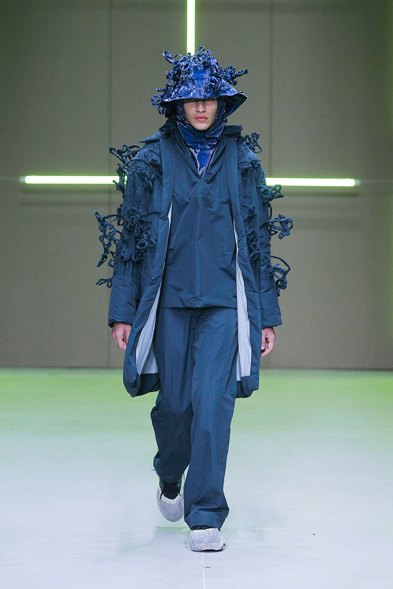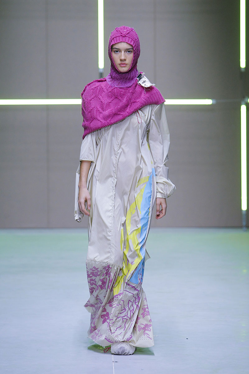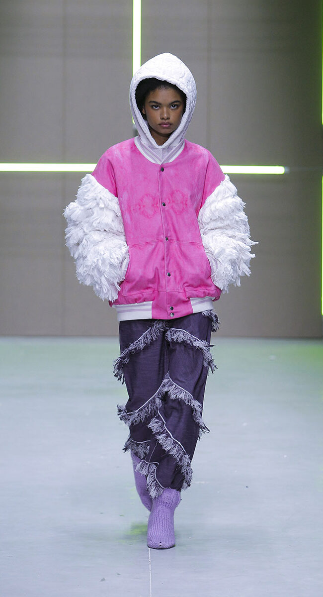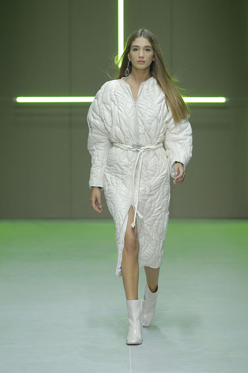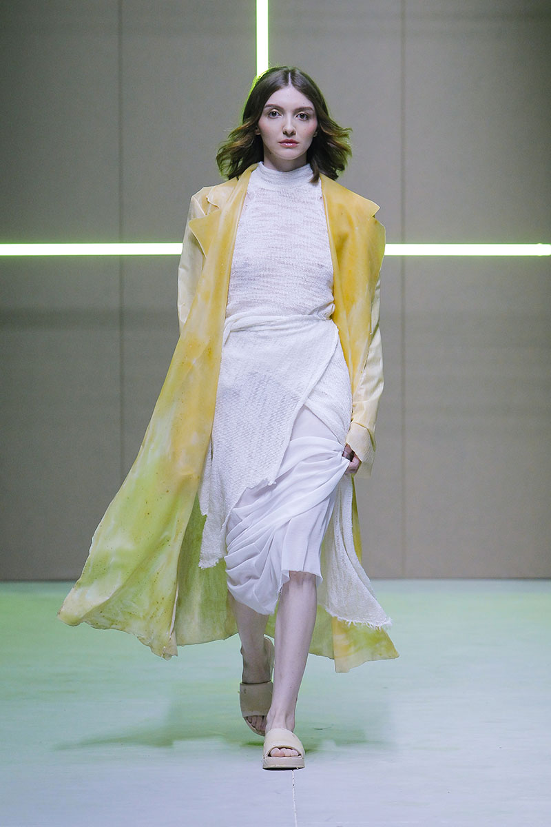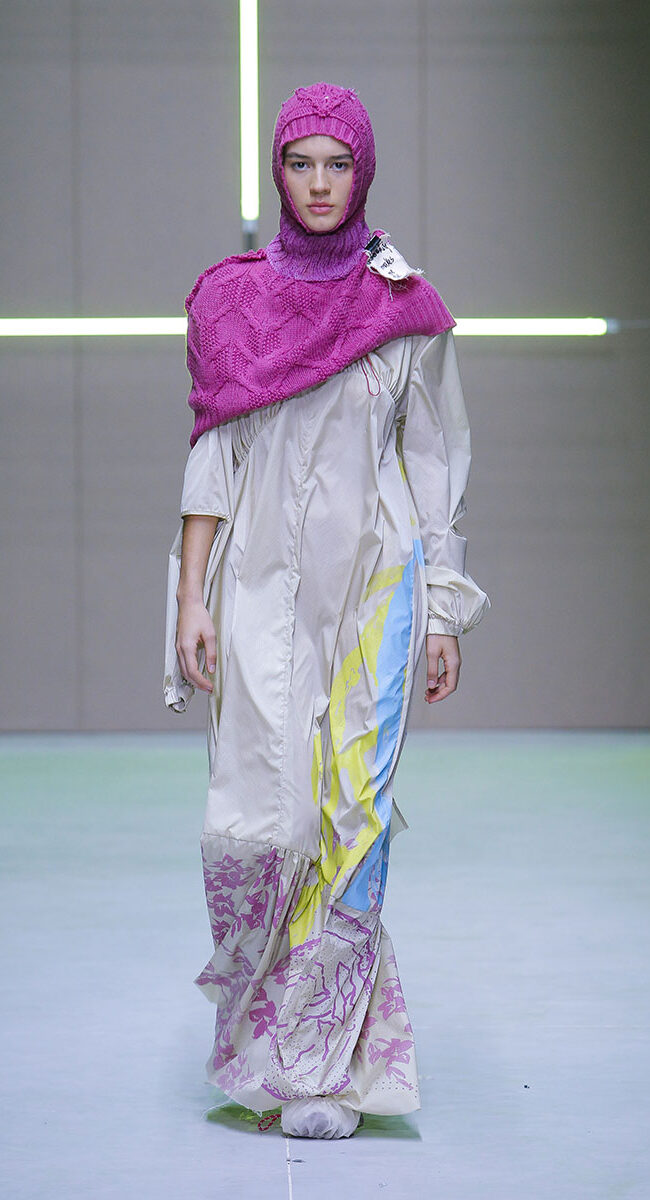 A través de sus diseños muestra cómo serían los uniformes de un “nuevo mundo” sin civilización, con calles llenas de ruinas y basura. Darya visualiza cómo la ropa vuelve a su función original de proteger y calentar. Las voluminosas y complejas piezas que presenta una de las cinco finalistas de Sangue Novo ModaLisboa SS23 se construyen a través de retales rescatados, mantas, cortinas y toallas. Es hora de abrazar el nuevo mundo.