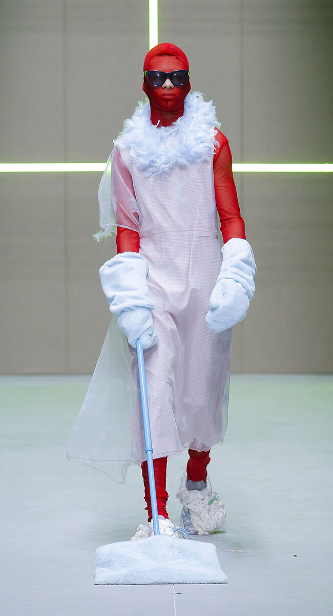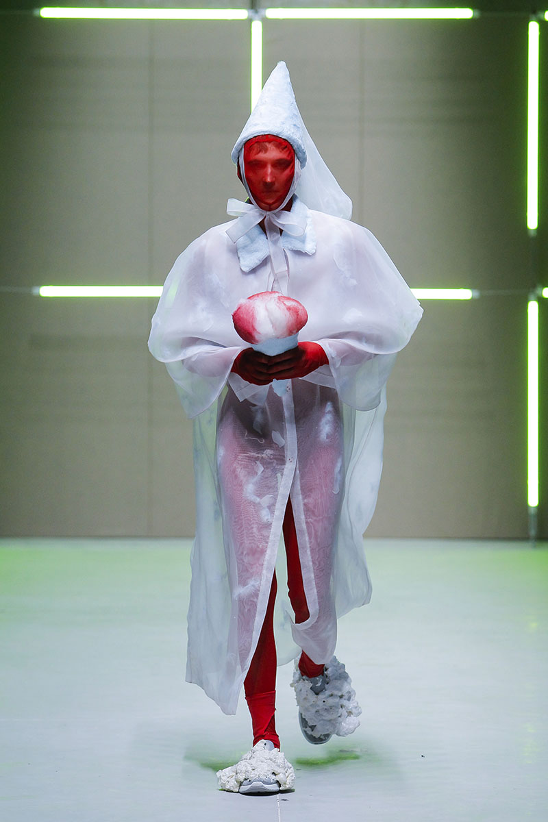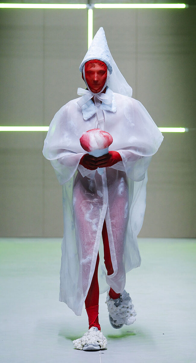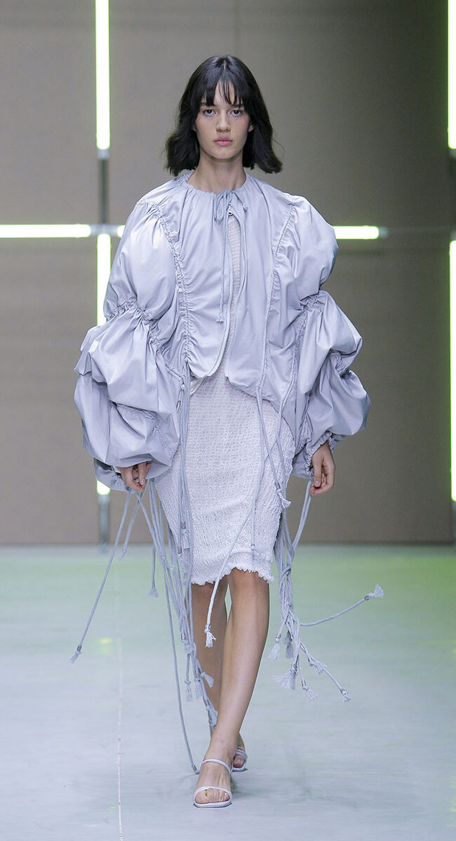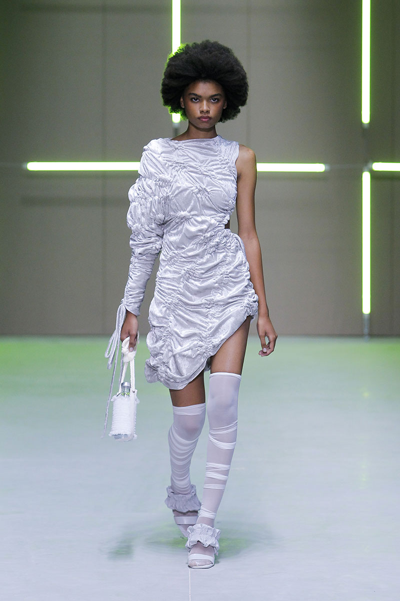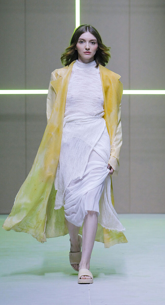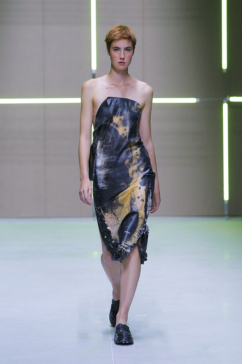 A través de sus diseños muestra cómo serían los uniformes de un “nuevo mundo” sin civilización, con calles llenas de ruinas y basura. Darya visualiza cómo la ropa vuelve a su función original de proteger y calentar. Las voluminosas y complejas piezas que presenta una de las cinco finalistas de Sangue Novo ModaLisboa SS23 se construyen a través de retales rescatados, mantas, cortinas y toallas. Es hora de abrazar el nuevo mundo.