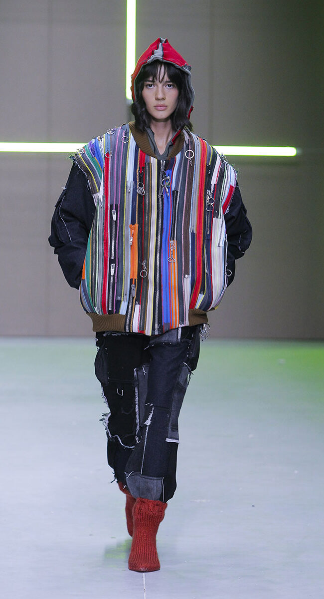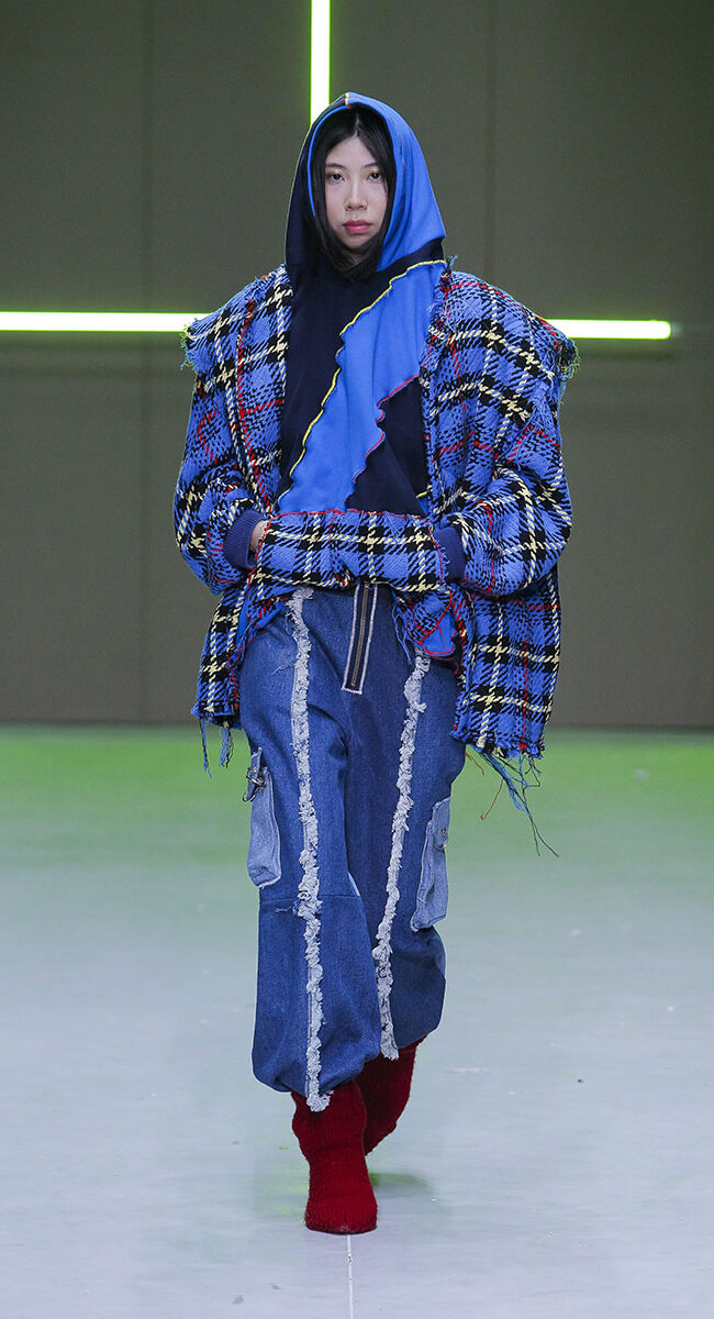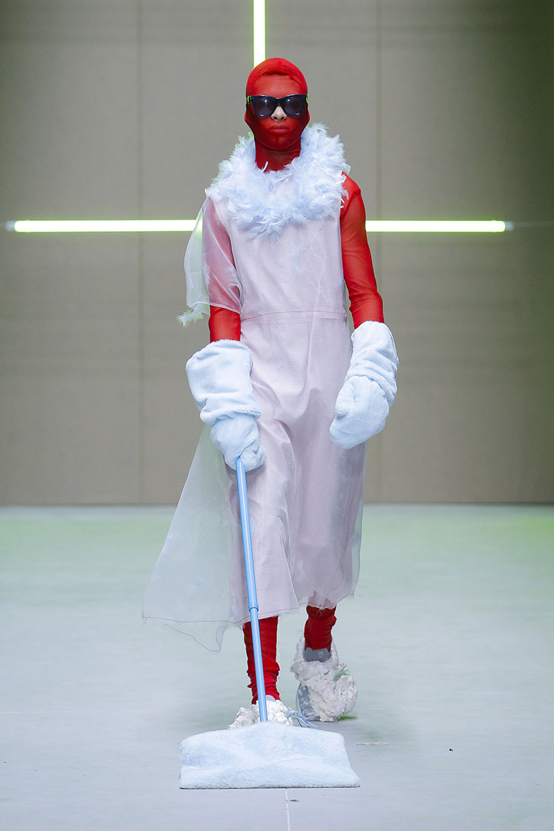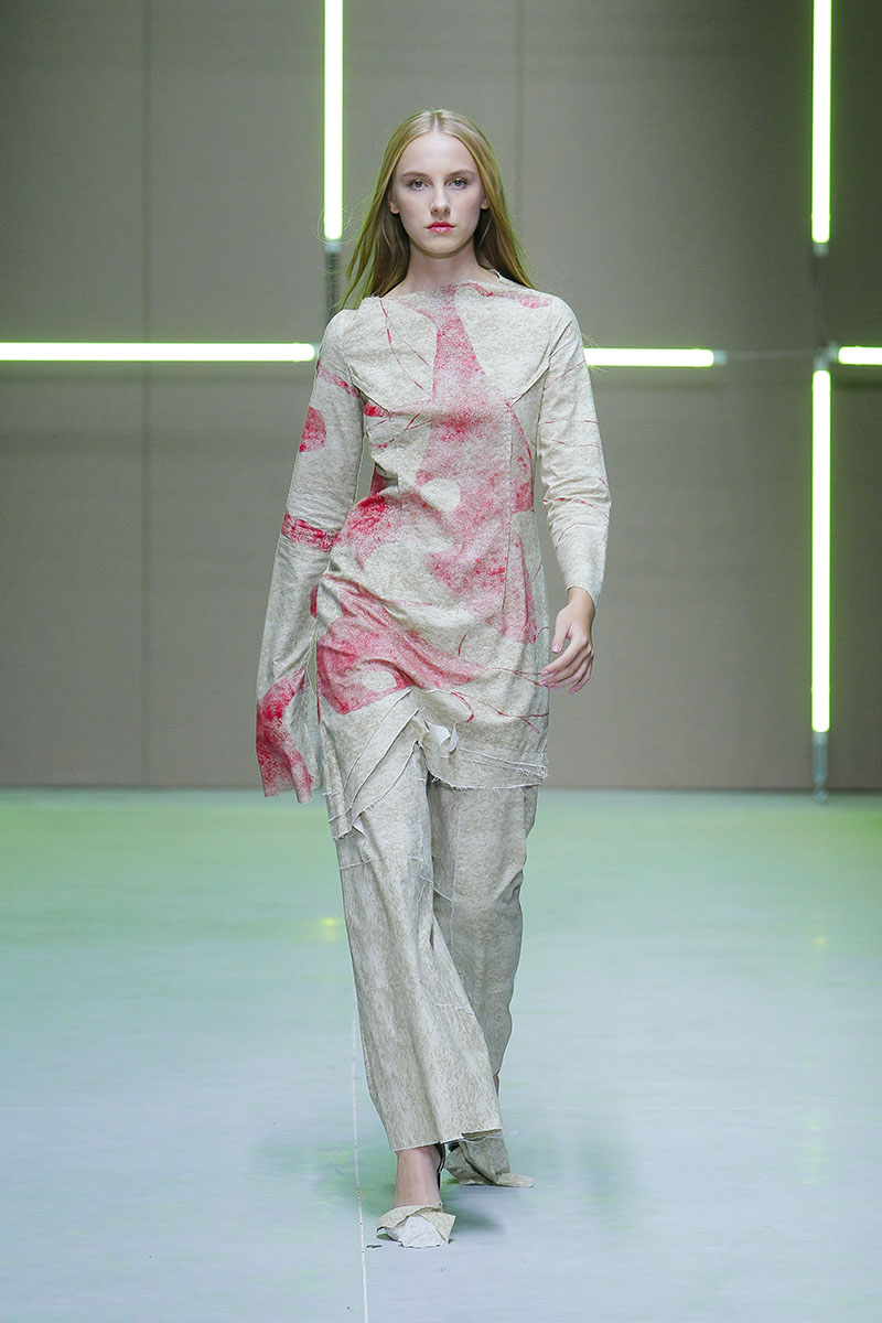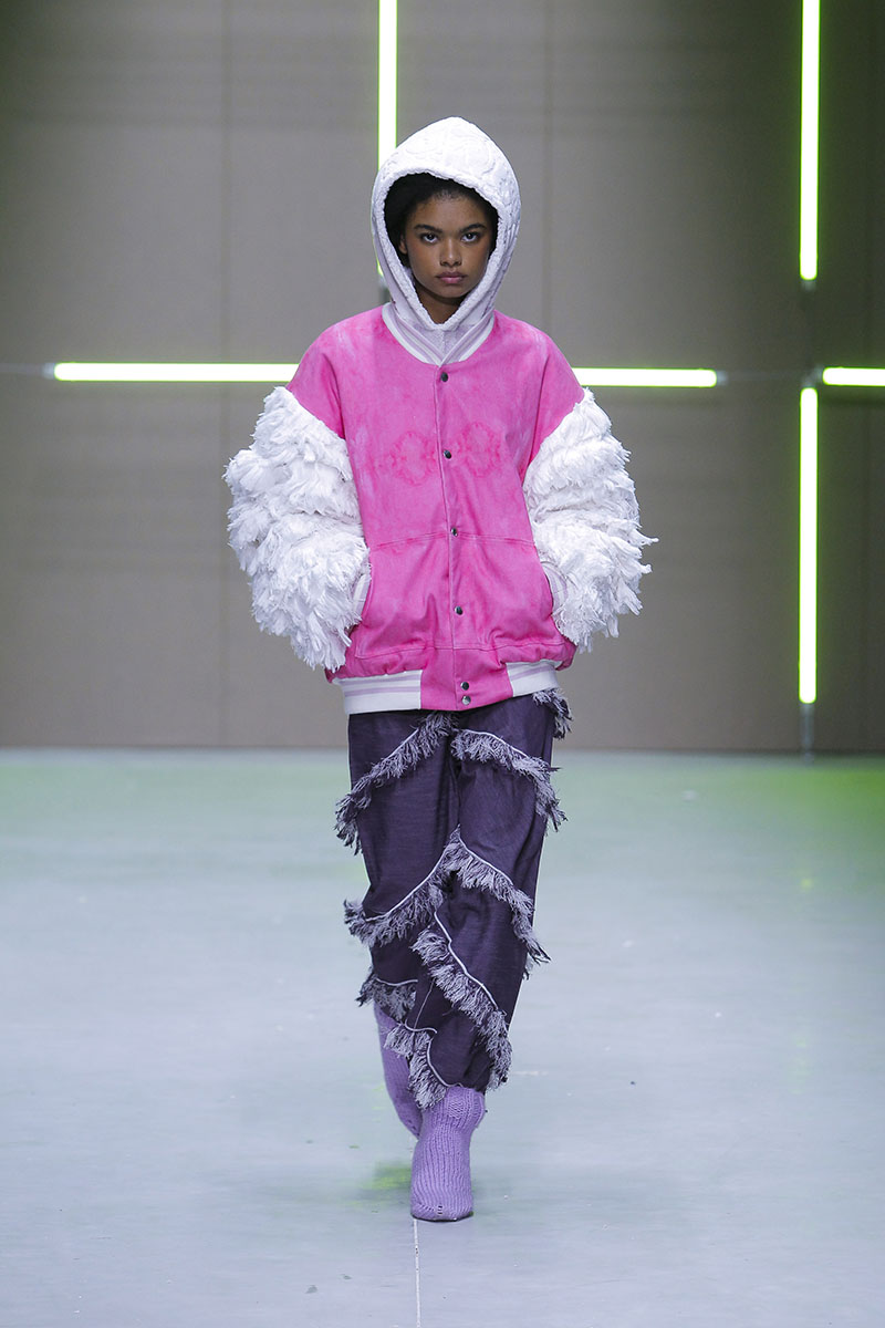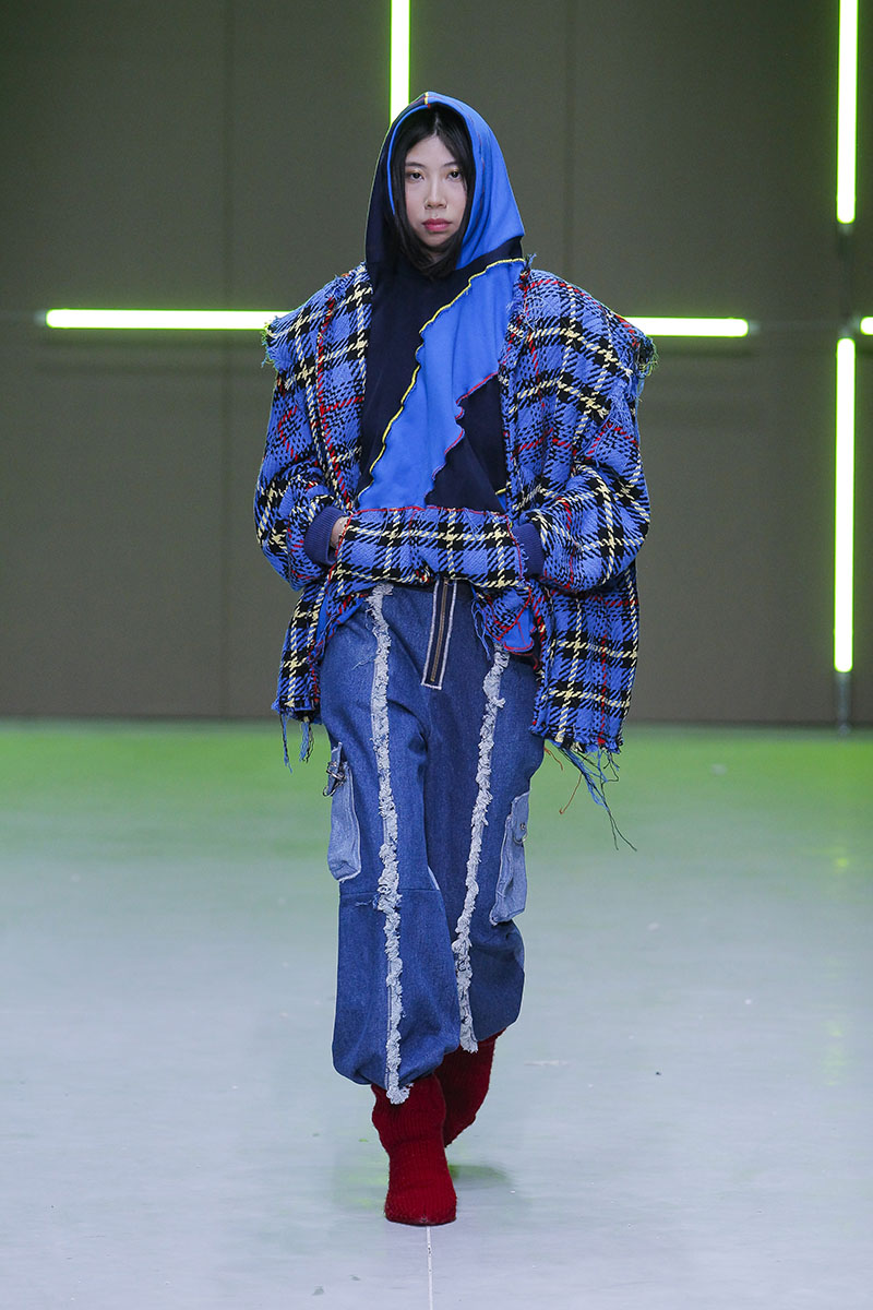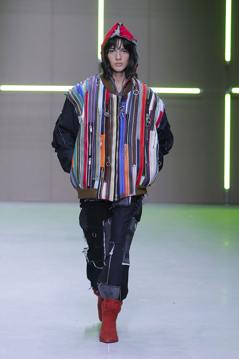 A través de sus diseños muestra cómo serían los uniformes de un “nuevo mundo” sin civilización, con calles llenas de ruinas y basura. Darya visualiza cómo la ropa vuelve a su función original de proteger y calentar. Las voluminosas y complejas piezas que presenta una de las cinco finalistas de Sangue Novo ModaLisboa SS23 se construyen a través de retales rescatados, mantas, cortinas y toallas. Es hora de abrazar el nuevo mundo.