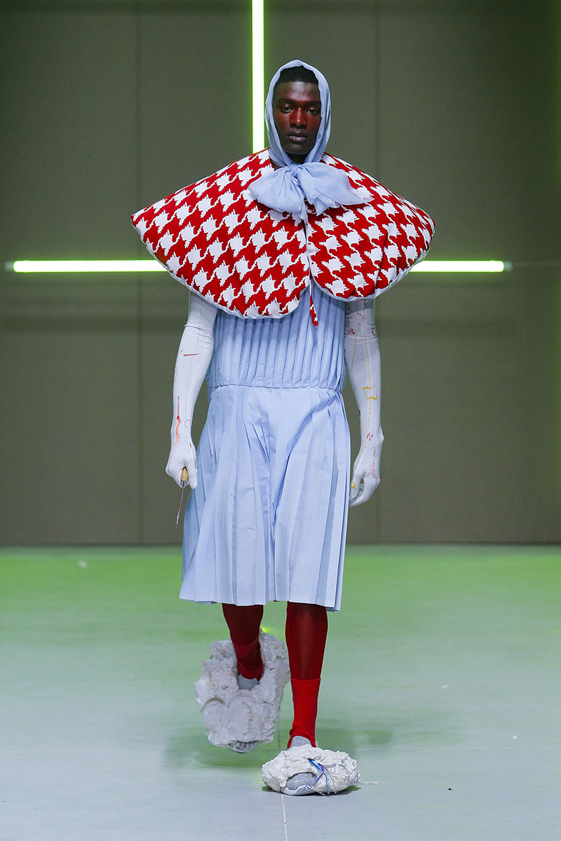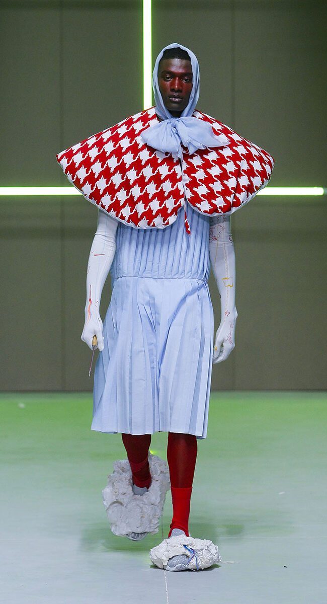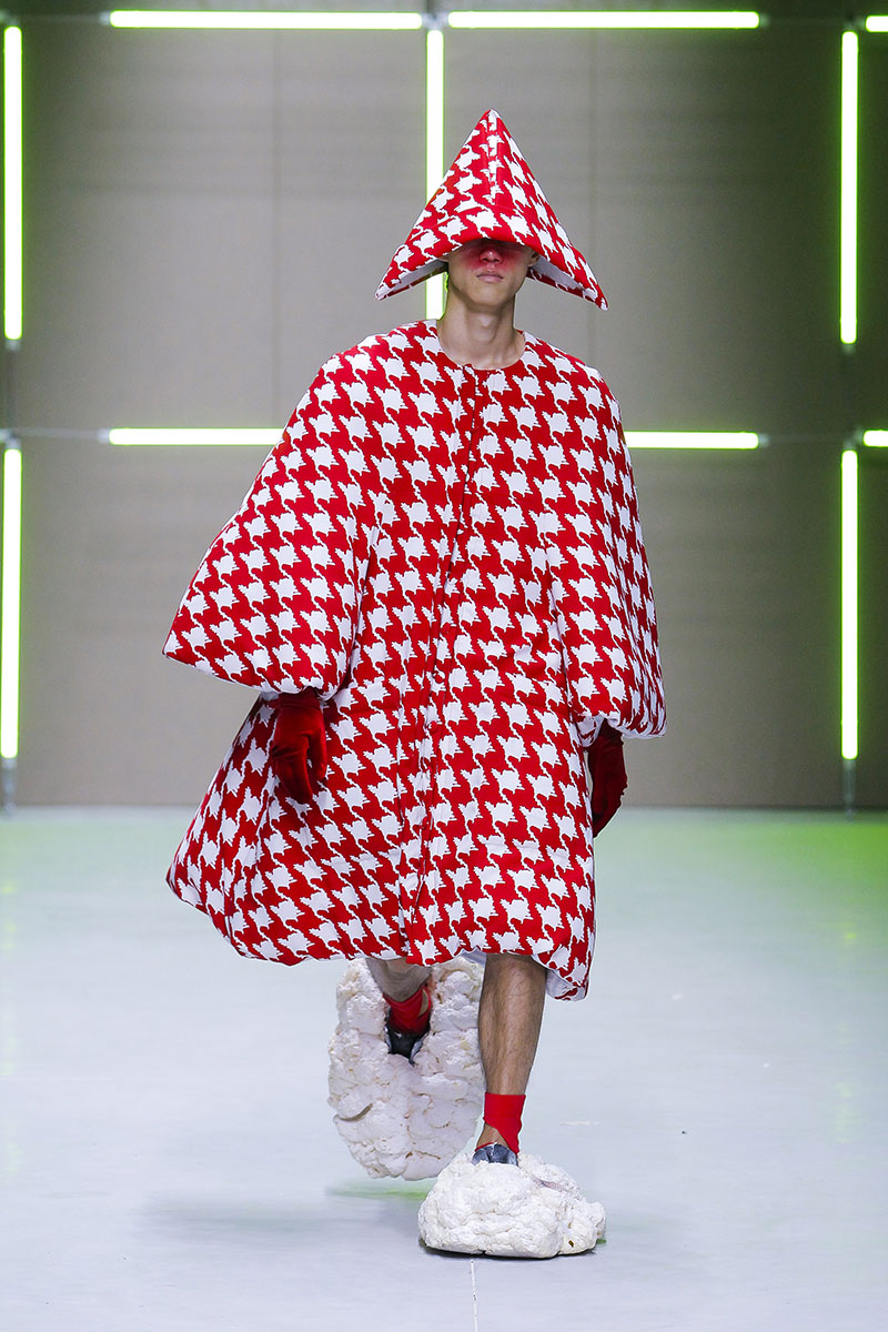 Las siluetas exageradas sumaban puntos a prendas estampadas con pata de gallo XXL, rayas o manchas asimétricas. El conjunto, muy equilibrado, podía parecer caricaturesco en un primer vistazo, pero todo estaba pensado hasta el último detalle, las formas de los looks estaban perfectamente compensadas y encontramos varios elementos muy interesantes y novedosos tanto en los accesorios como en las prendas principales.