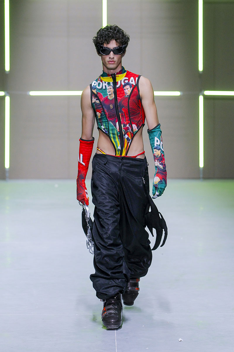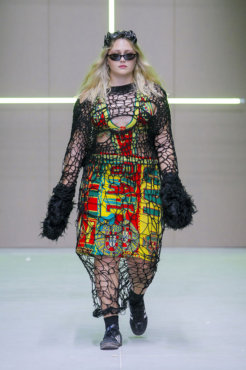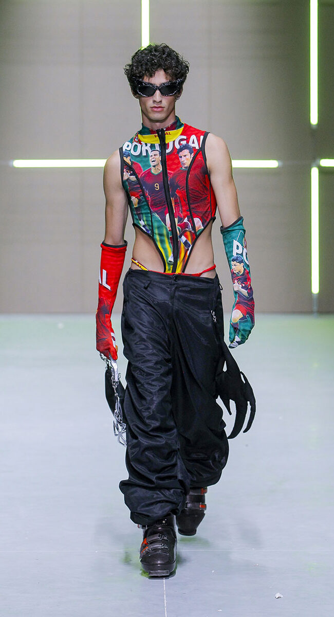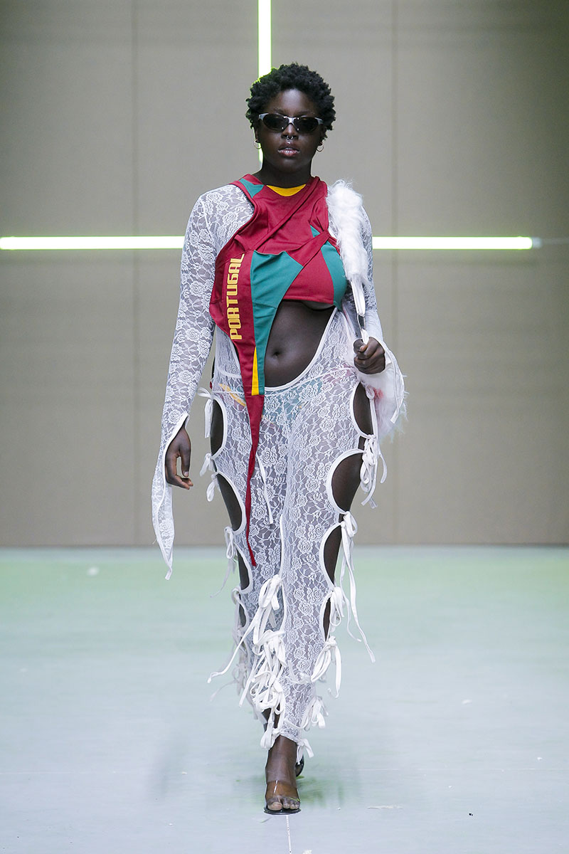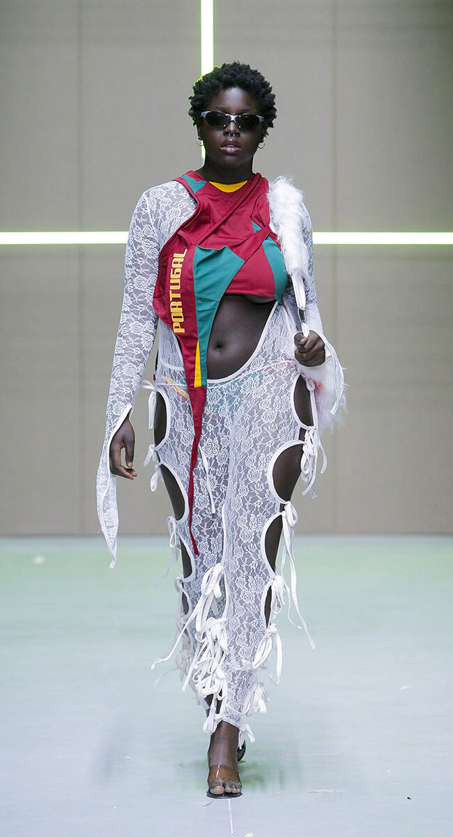 Los vanguardistas diseños están construidos a través de clásicos elementos de la cultura “tuga” como las bufandas de clubes deportivos, napperons bordados por la abuela, camisetas de fútbol deconstruidas de esos primos que volvían a casa cada verano. El gusto personal de la diseñadora se mezcla de manera exquisita con su exploración del entorno más clásico y típico. En parte esta colección es una especie de sátira sobre el pueblo donde creció y del que (evidentemente) está muy orgullosa.