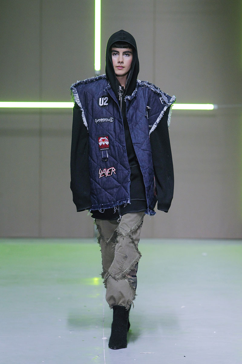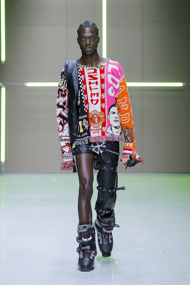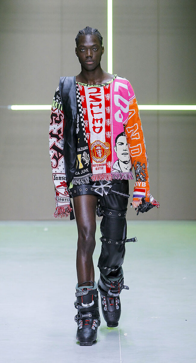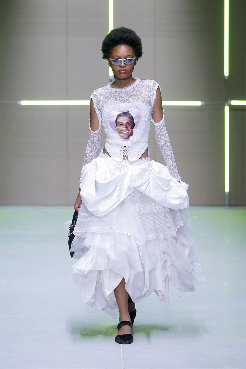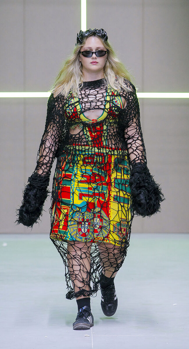 Los vanguardistas diseños están construidos a través de clásicos elementos de la cultura “tuga” como las bufandas de clubes deportivos, napperons bordados por la abuela, camisetas de fútbol deconstruidas de esos primos que volvían a casa cada verano. El gusto personal de la diseñadora se mezcla de manera exquisita con su exploración del entorno más clásico y típico. En parte esta colección es una especie de sátira sobre el pueblo donde creció y del que (evidentemente) está muy orgullosa.