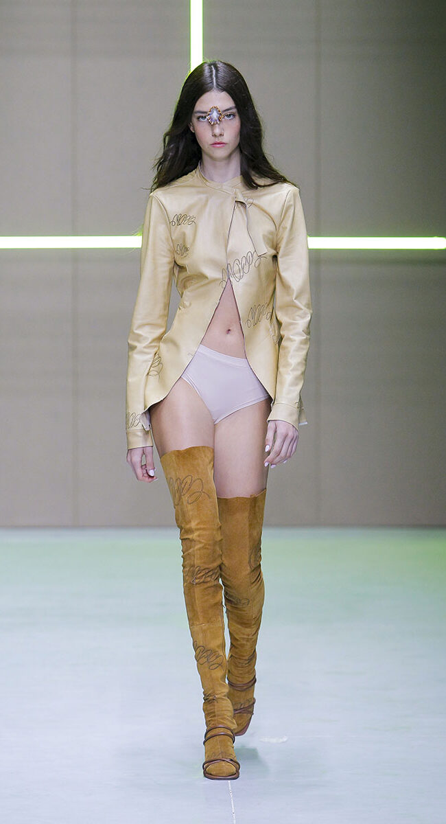 La corona de laurel de Apolo está también presente en las formas redondas y en las hojas de laurel acolchadas bordadas en la dermis de las prendas. Joana construye formas esculturales, piezas muy detalladas y complementos metálicos inspirados en el momento de la transformación de Daphne.