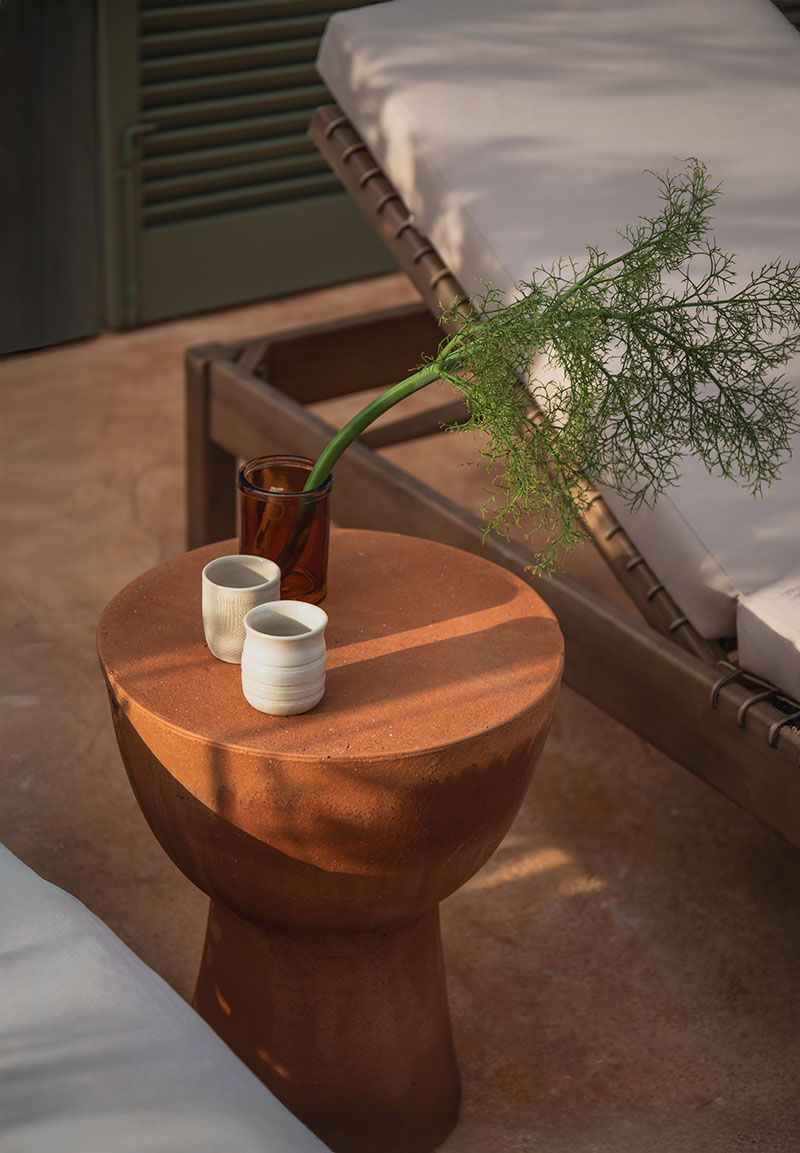 El mobiliario y los elementos decorativos han sido elaborados por artesanos locales o por firmas que comparten una filosofía de diseño consciente. La colaboración con Let’s Pause, por ejemplo, se traduce en cabeceros tejidos a mano con fibra de fique, lámparas de diseño artesanal que suavizan la luz y mesas exteriores moldeadas en barro cocido a alta temperatura. Todo transmite una estética serena, sin artificios, que privilegia la conexión con la materia y el origen.